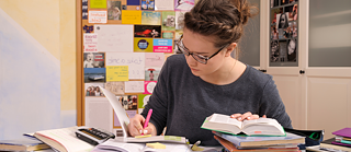 Eine junge Frau arbeitet an ihren Übungen zur Vorbereitung auf die Prüfung 'Goethe Zertifikat'. Sie sitzt an ihrem Schreibtisch und hat den Kopf über ihre Bücher gebeugt. © Goethe-Institut