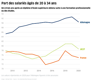 Les années 1990 ont vu la naissance d’une troisième voie éducative en Allemagne. Depuis 2009, il est ainsi possible de suivre un cursus universitaire général après une formation professionnelle continue. Suite à une formation professionnelle étoffée de trois ans minimum d’expérience professionnelle, on peut aussi envisager un cursus universitaire spécialisé. En France, où de tels processus d‘admission existent déjà de longue date, nombreux sont les cursus professionnalisants à proposer des formations de courte durée, ce qui n’est pas le cas en l’Allemagne. Pour autant, le nombre élevé de diplômés de coïncide pas nécessairement avec une insertion rapide dans le monde du travail. Parmi les 20 – 34 ans, le taux de salariés à entrer dans le monde du travail un à trois ans après l’obtention du diplôme s’avère en effet bien plus faible en France qu’en Allemagne.