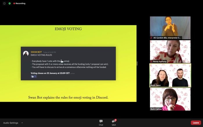 - Emoji-Abstimmung: Jede Person kann über ein Schwan-Emoji genau eine Stimme abgeben. Der künstlerische Projektantrag, der 5 oder mehr Schwäne bekommt, erhält die gesamten Mittel. Die Mehrheit der Stimmen ging an ein Projekt für ein Hörspiel, das in nicht mehr als drei Stunden und in einer einzigen Einstellung geschrieben und aufgenommen werden soll. Das Hörspiel soll verschiedene Elemente untersuchen, die für die Black-Swan-Arbeitsgruppe, Trust und die Schwarzer-Schwan-Theorie relevant sind.