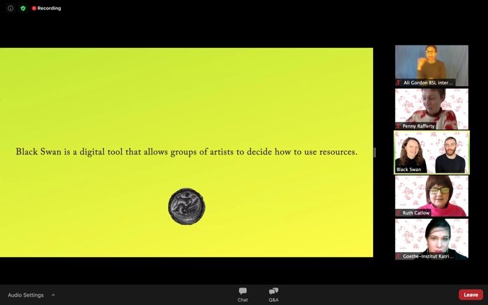 Die erste Online-Session der Reihe beschäftigte sich mit Black Swan DAO, einem Experiment zu einem dezentralisierten Konzept für aktuelle Finanzierungs- und Ressourcenmodelle in der Kunst. Laura Lotti und Calum Bowden, die Künstler*innen und Denker*innen hinter dem Projekt, wollten die zunehmende Prekarität künstlerischer Praktiken und anderer Formen kultureller Arbeitfrontal angehen. Derzeit konzentrieren sich die Ressourcen, Gelder und Mechanismen in der Kunstszene in der Regel in den Händen etablierter Institutionen. Was, wenn sie zu Kulturschaffenden umgelenkt werden könnten?
