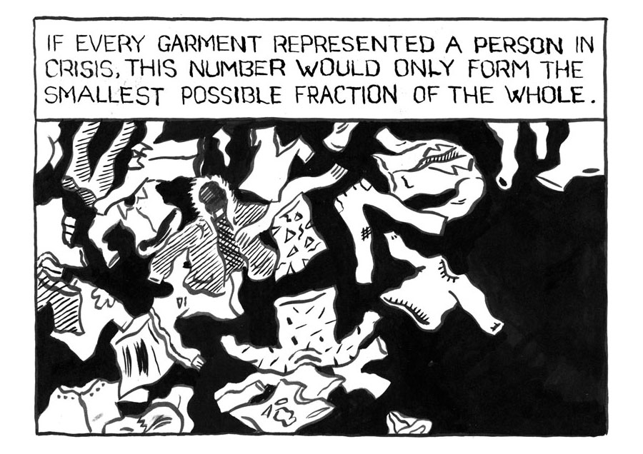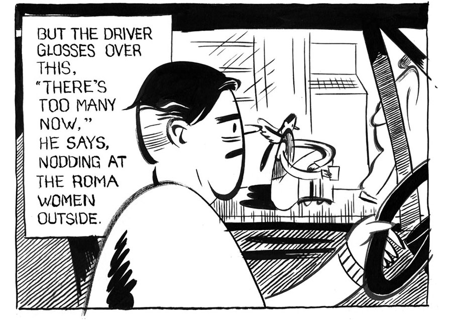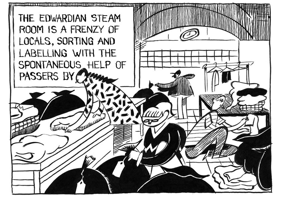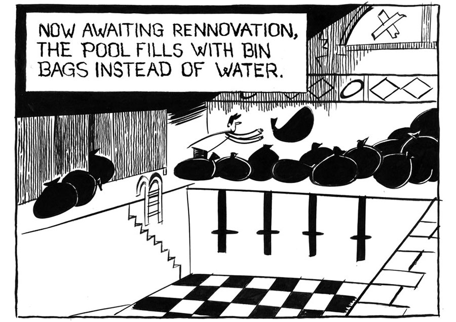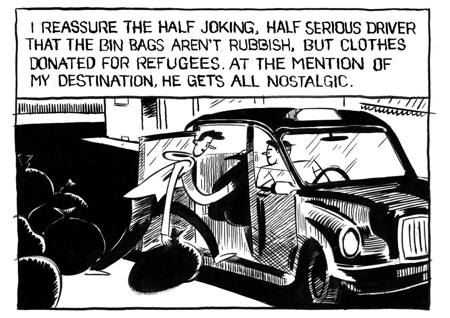 The pool is now derelict and awaiting renovation – the comic depicts a donation event at the pool, collecting clothes for refugees, and the xenophobia of one taxi driver.