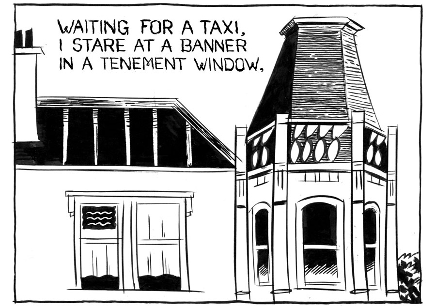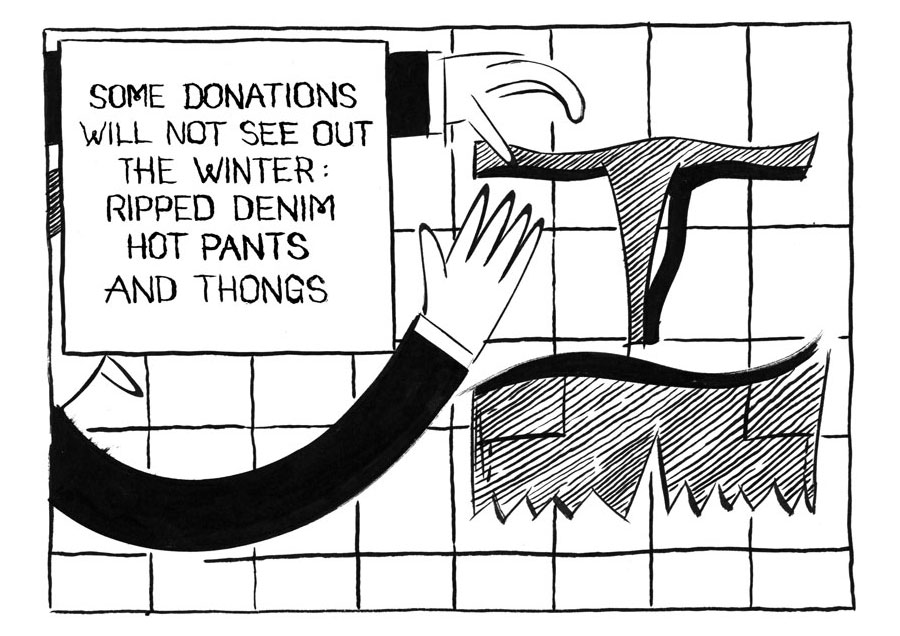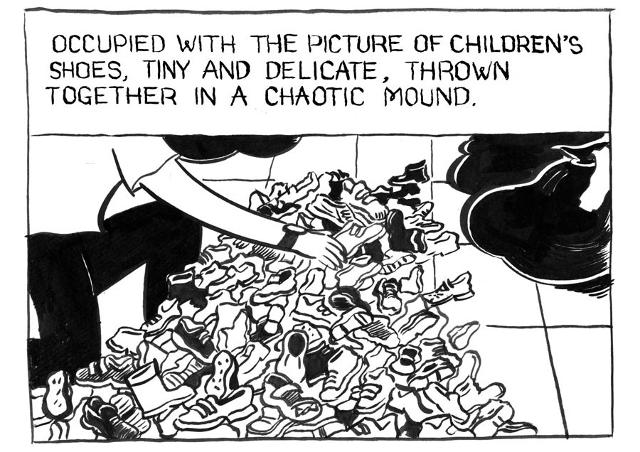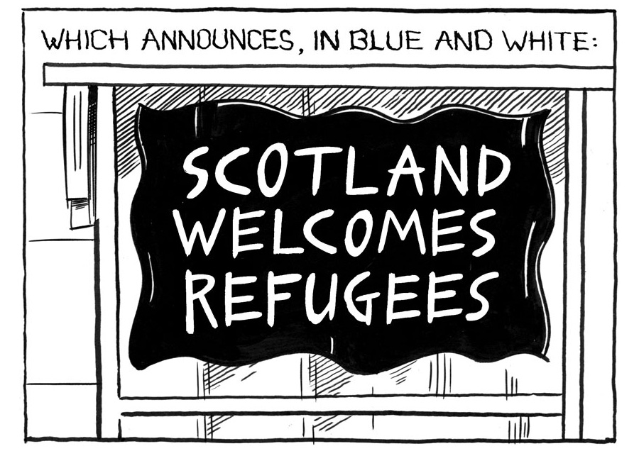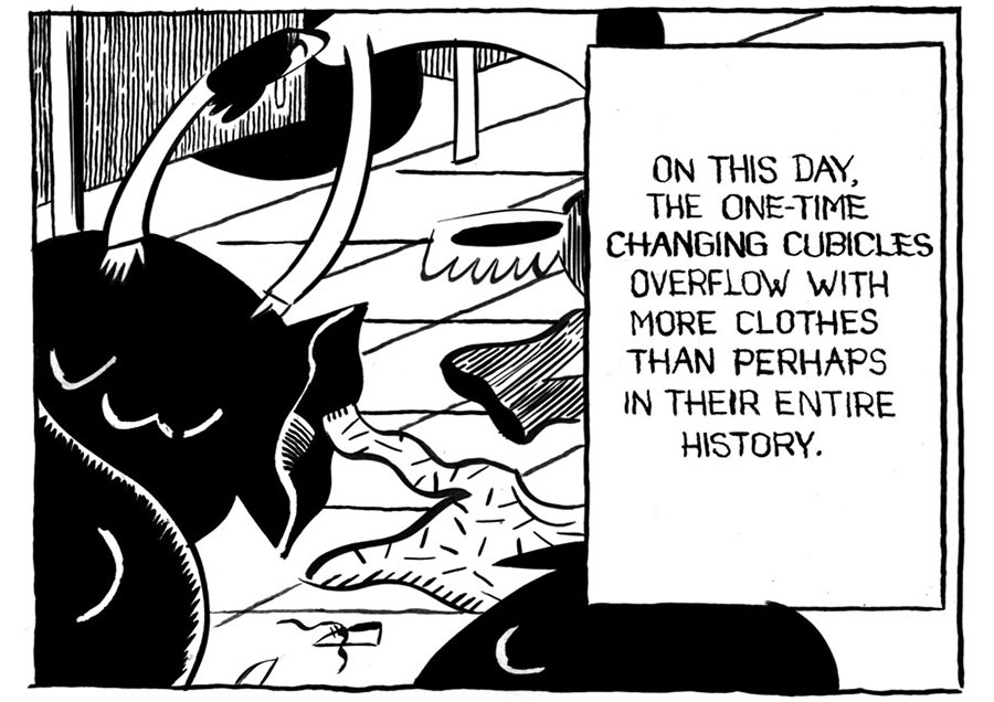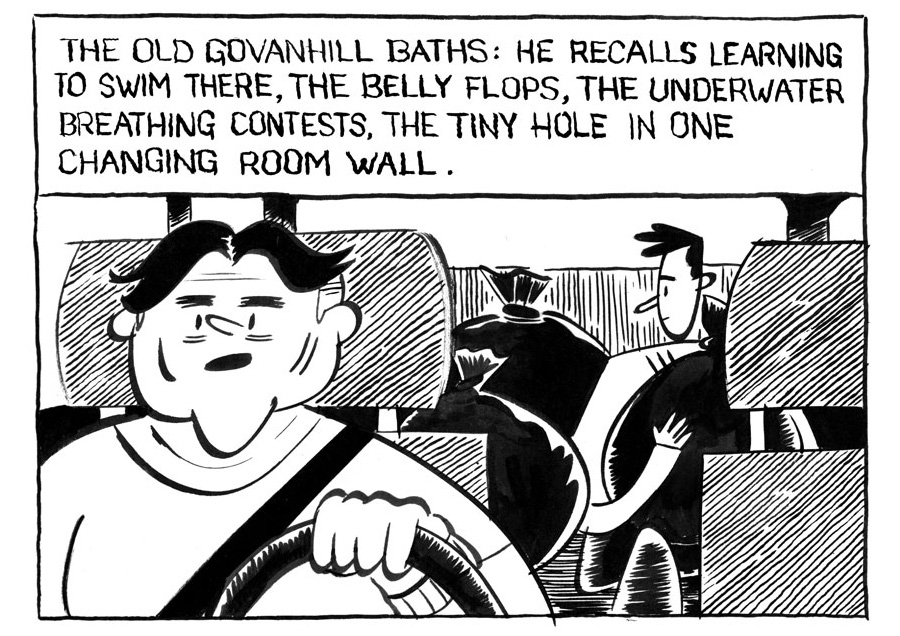 The pool is now derelict and awaiting renovation – the comic depicts a donation event at the pool, collecting clothes for refugees, and the xenophobia of one taxi driver.