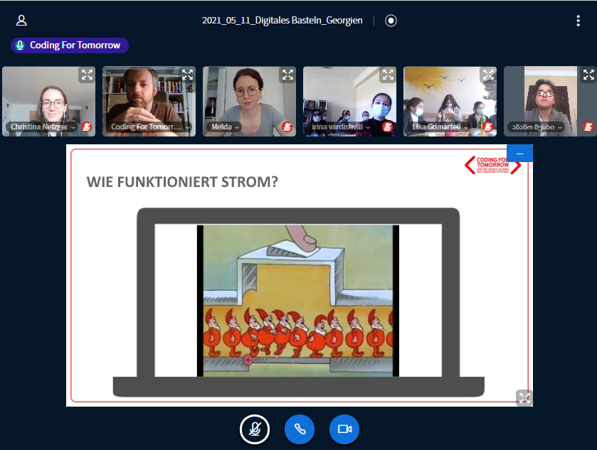 Referent*innen von "Coding for tomorrow" erklärten den Schüler*innen auf Deutsch, wie ein Stromkreislauf funktioniert. In einer Simulation von LEIFIphysik konnten die Schüler*innen selbst ausprobieren, welche Materialien leitend sind und was nötig ist, um eine Lampe zum Leuchten zu bringen.