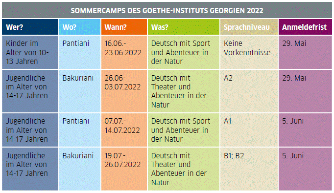 Dann melde dich unbedingt für unsere Sommercamps an. Wir haben für dich ein tolles Freizeitprogramm und innovativen Deutschunterricht mit deutschen und georgischen LehrerInnen und BetreuerInnen!