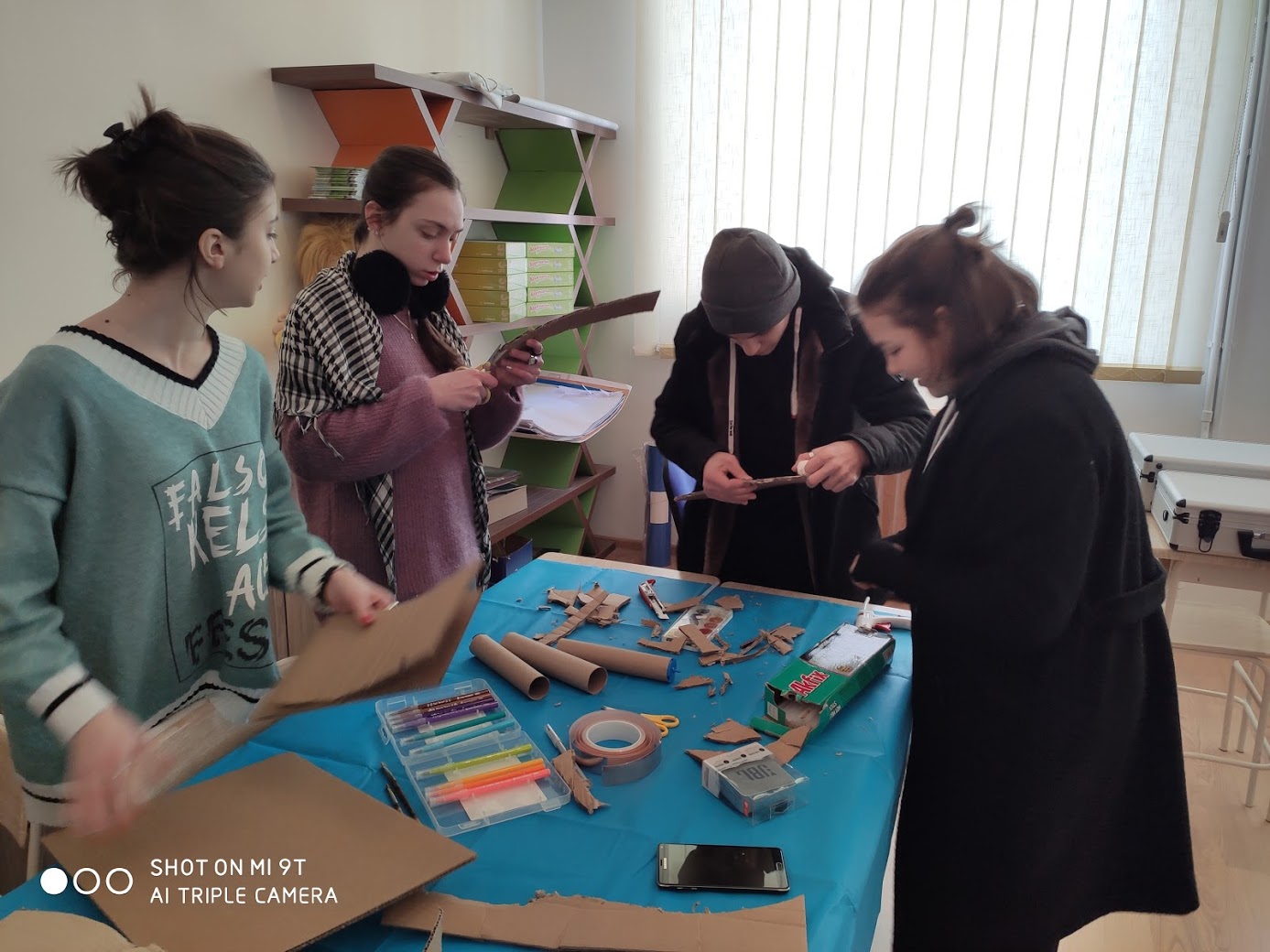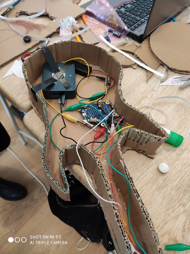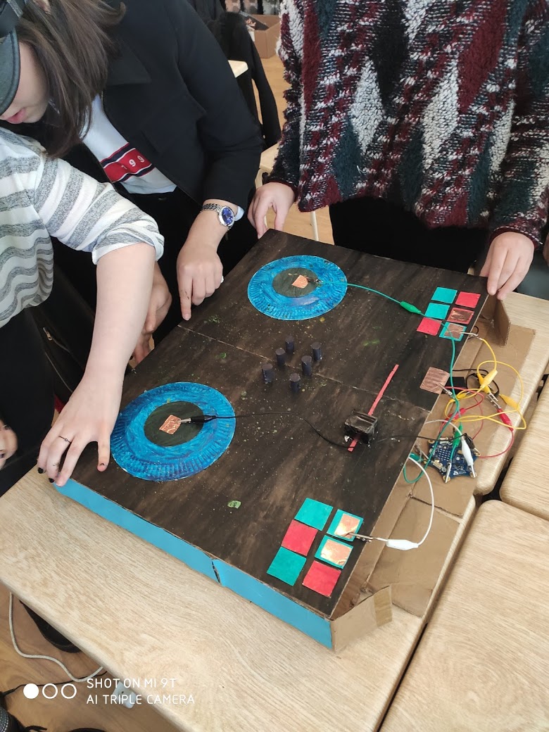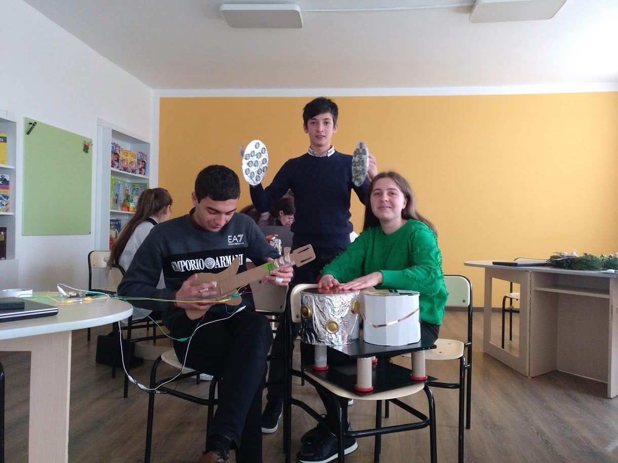Die Schüler*innen der PASCH-Schulen in Kachati und Kutaissi haben genau das an nur einem Tag bewältigt. Sie erlernten die Grundlagen des Programmierens mit dem Calliope mini und konnten dann ihren Ideen beim Bau eigener Instrumente freien Lauf lassen. Aus Pappe, alten Computern und Kronkorken entstanden Gitarren, Trommeln und sogar ganz neu erfundene Instrumente. Noch ein kleines Programm für den Calliope mini schreiben, alles verkabeln und schon kann mit den Instrumenten auch tatsächlich Musik erzeugt werden. Auch Wörter wie „Heißklebepistole“, „Stromkreislauf“ und „Kupferklebeband“ kennen die Schüler*innen jetzt auf Deutsch …