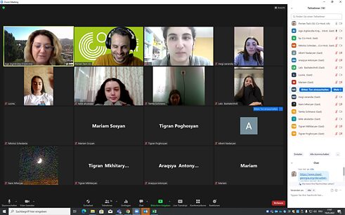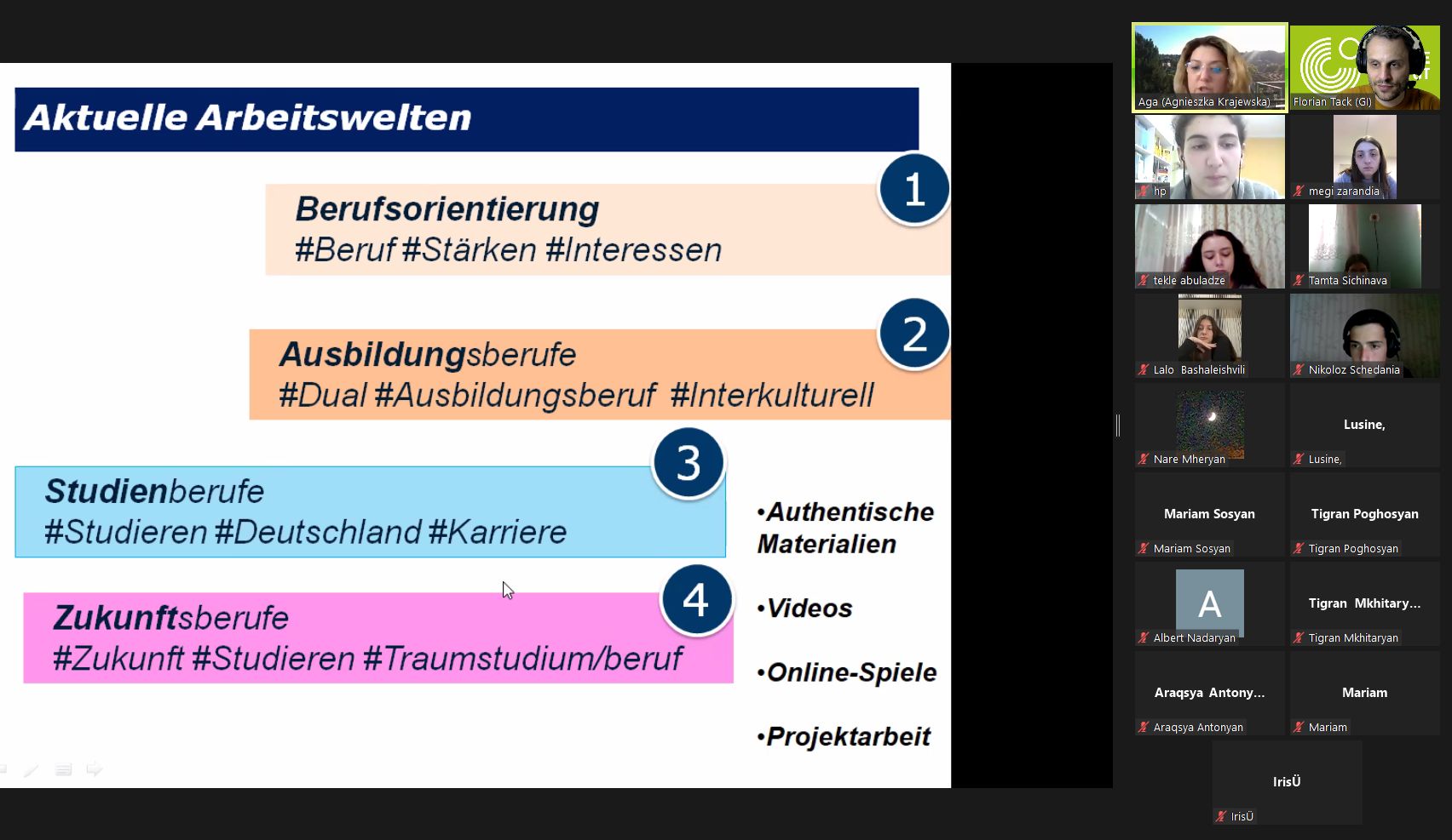 Dort setzten sich 20 Schülerinnen und Schüler aus Georgien und Armenien mit ihren Berufswünschen auseinander und lernten mit Hilfe digitaler Tools viel Neues über die deutsche Bildungslandschaft, so etwa über die duale Ausbildung oder das deutsche Hochschulsystem.Daneben setzten sich mit praktischen Problemen auseinander, wie z.B. „Wie finanziere ich mir mein Studium?“, „Welche sozialen Kompetenzen sind für den Beruf essenziell?“ oder „Welche Berufe sind zukünftig besonders gefragt?“
