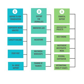 The three pillars of the IMM Program, support to public service media, support to journalists and financial support, are closely interconnected. These include: