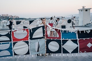 Auch die griechische Künstlerin Nefeli Papadimouli, die zwischen Athen und Paris, Architektur und Kultur pendelt, nutzt den Stadtraum als Inspirationsquelle für ihre performativen Installationen von eigentümlicher Schönheit. Sie greift formale und farbliche Elemente der architektonischen Umgebung auf, übersetzt sie in textile Entwürfe, die zu Fahnen, Körperhüllen, Stoffräumen werden und mit den Beton- und Steinlandschaften in eigenwilligen Dialog treten –so auch bei der Präsentation ihrer Workshopteilnehmerinnen auf dem Dach des Institut Français zum Sonnenuntergang.