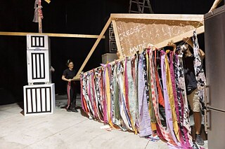 Der griechische Künstler Adonis Volanakis wiederum hat eine sehr freie Auffassung davon, was Szenografie sein kann:Mit Joseph Beuys könnte man bei ihm von Bühne als sozialer und performativer Plastik sprechen. Volanakis, der sich als „Host Servant“ (Gastdiener) und „performative social weaver“ betrachtet, schafft künstlerische Begegnungen mit Expertinnen des Alltags, in denen traditionelle Kulturtechniken wie Backen, Weben, Kochen als plastische Künste betrachtet und in den Kontext antiker Mythologie gestellt werden. Dazu sucht er vor allem private und semiprivate Räume auf; die Szenografie ergibt sich aus dem Umfeld der Expert*innen, mit denen er kooperiert. Das Framing von Alltagsräumen als Theaterbühne hat eine eigene Tradition, die eng mit Formen des Dokumentartheaters und sitespecific Performances verknüpft ist:Es ermöglicht dem Publikum eine andere Wahrnehmung der Realität.