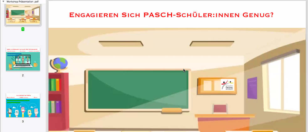 Durch den Workshop zum Thema „Digital gestaltendes Denken“, der im Rahmen des Treffens angeboten wurde, erhielten die Teilnehmenden die Chance, sich mit verschiedenen Präsentationstechniken vertraut zu machen. Durch die Stärkung ihrer digitalen Kompetenzen können engagierte PASCH-Alumni bei zukünftigen PASCH- (Alumni-)Events noch besser (mit)wirken und als Multiplikator*innen agieren. Visionäres Ziel dabei ist, Strukturen aufzubauen, die ein höheres Maß der Aktivierung von PASCH-Alumni ermöglichen.