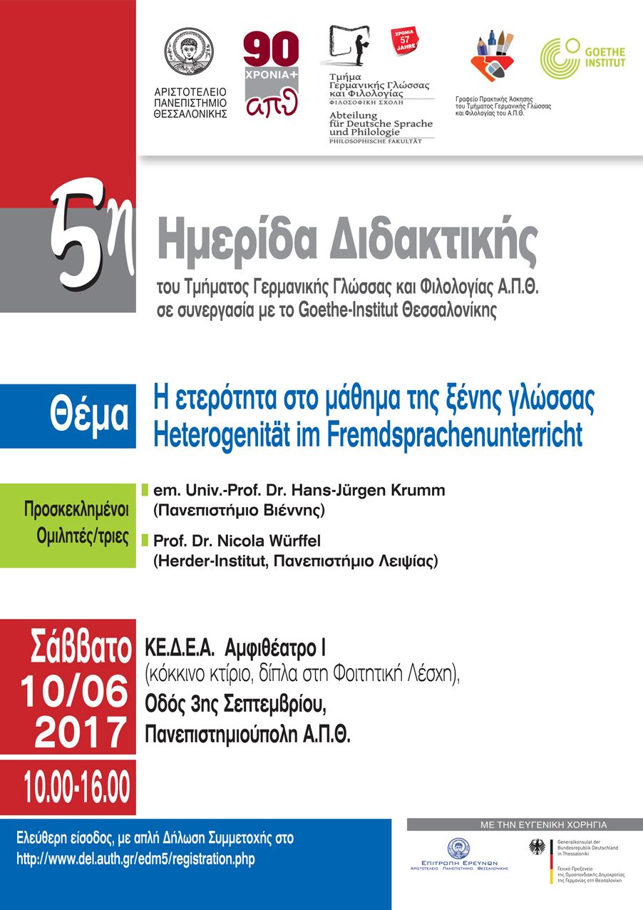 Το Τμήμα Γερμανικής Γλώσσας και Φιλολογίας Α.Π.Θ. σε συνεργασία με το Goethe-Institut Thessaloniki, διοργανώνει για πέμπτη συνεχόμενη χρονιά τη σειρά Ημερίδων Διδακτικής που εγκαινιάστηκε με επιτυχία το 2013. Θέμα της 5ης Ημερίδας είναι: «Η ετερότητα στο μάθημα της ξένης γλώσσας»