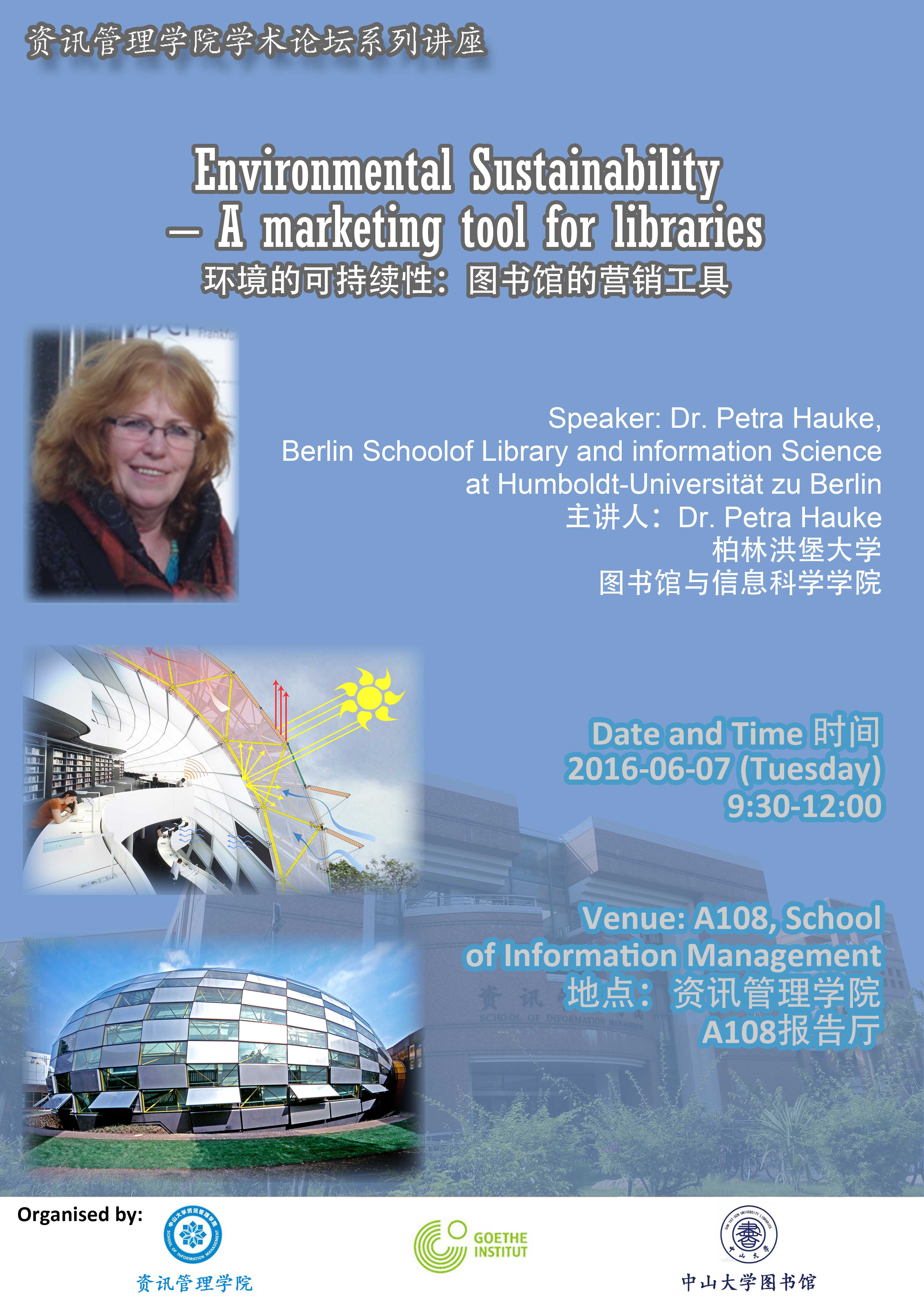 這場講座將會展示來自全世界公共圖書館的例子。其中提到的圖書館都獲得了國際圖書館協會聯合會2016年度的綠色圖書館獎。主講人會借助大量的實例,講解一個“綠色”圖書館的創意如何得以貫徹:使用環保材料或者可循環材料,采用網絡用戶服務,節省資源的覆印服務,垃圾分類,取締塑料袋,圖書館咖啡館不再使用紙杯,而是可以循環使用的瓷杯或者屬於私人的瓷杯,采用公平貿易咖啡,“綠色”活動,挑選具有“綠色”資質證書的圖書館供應商或者是部分采取以上措施。