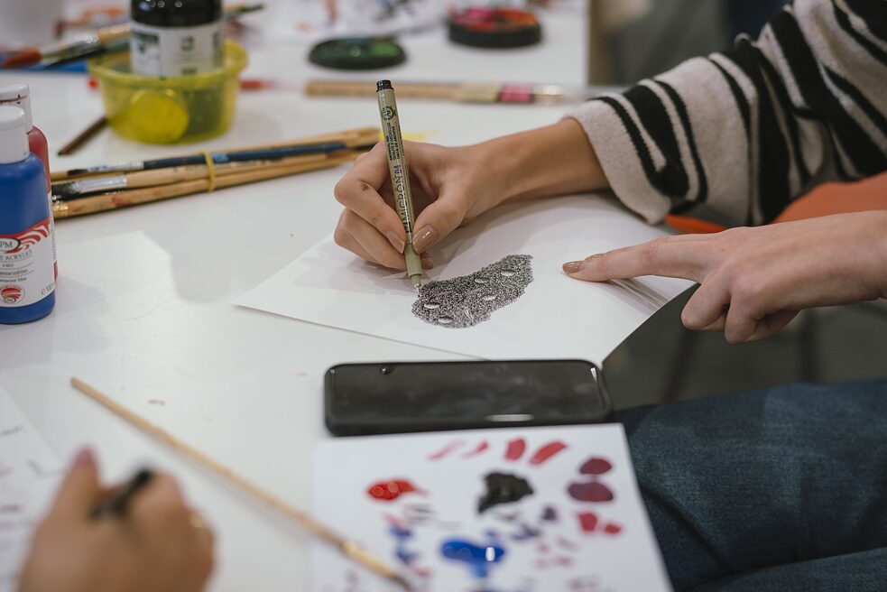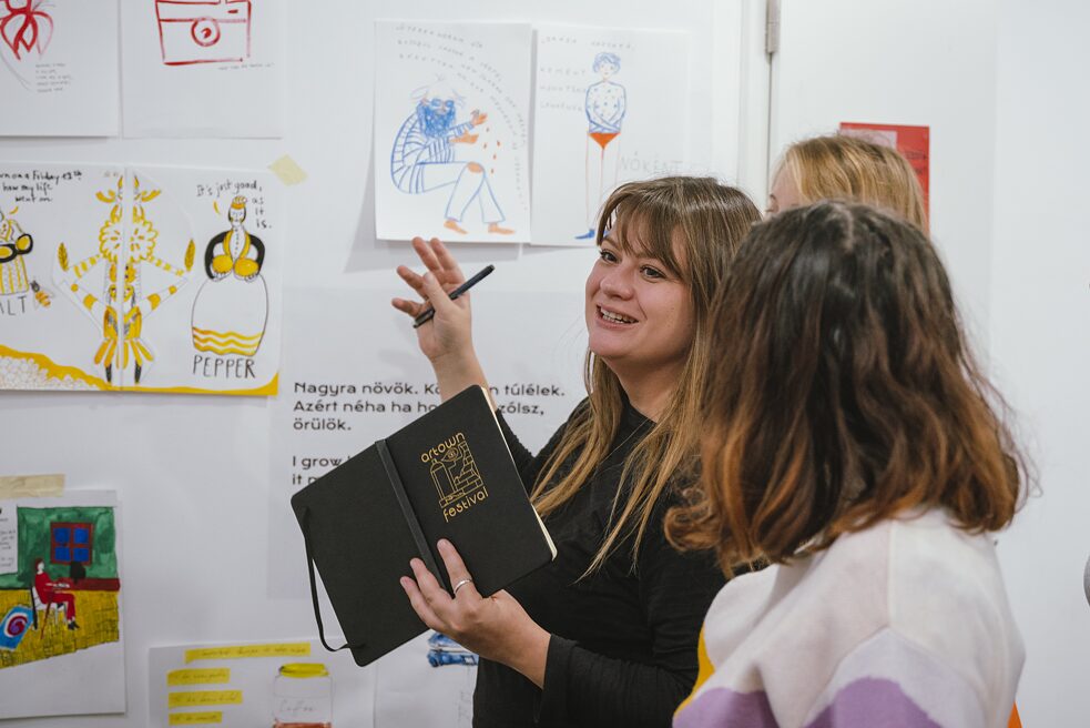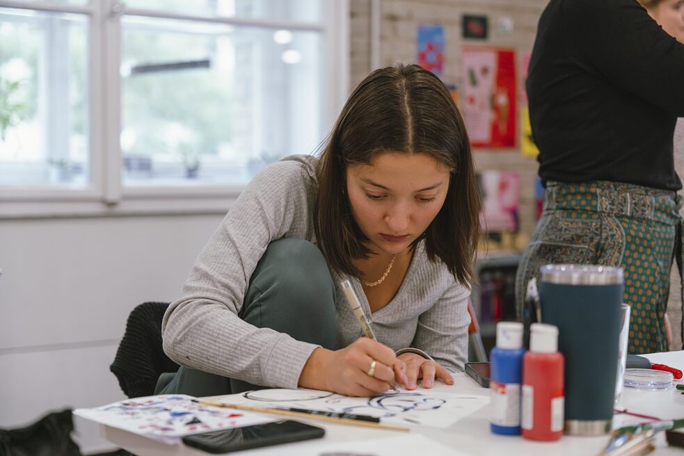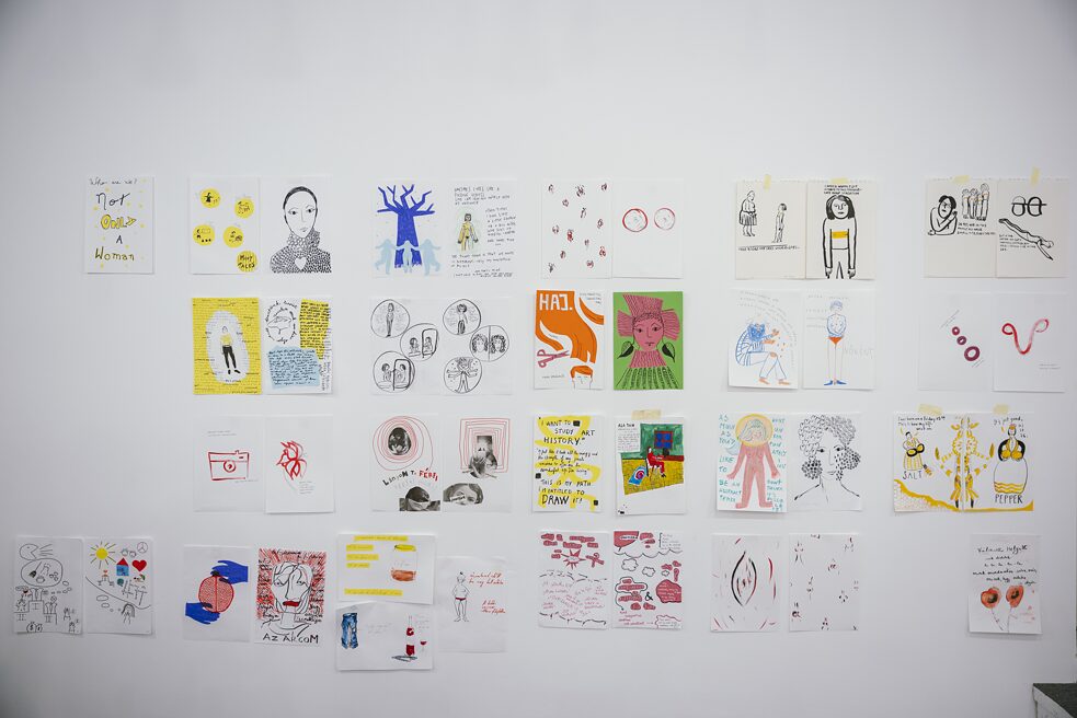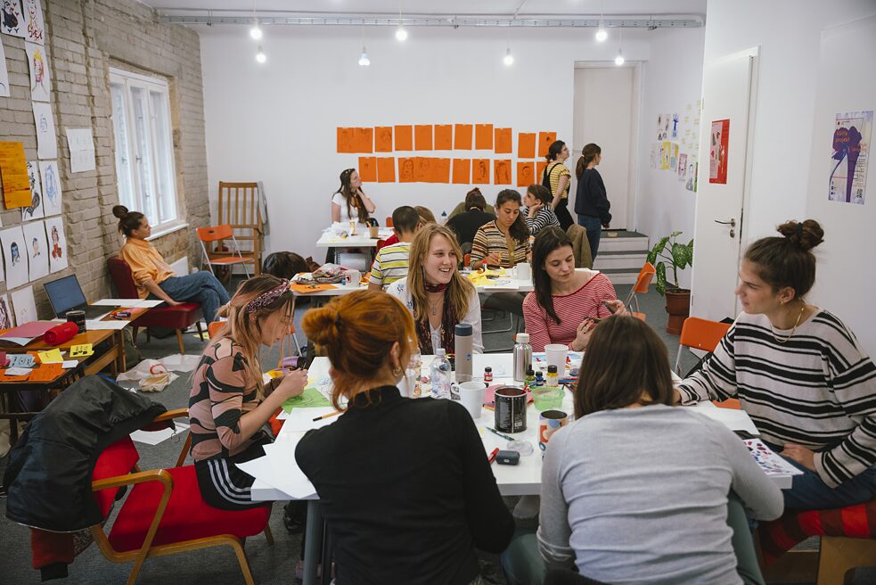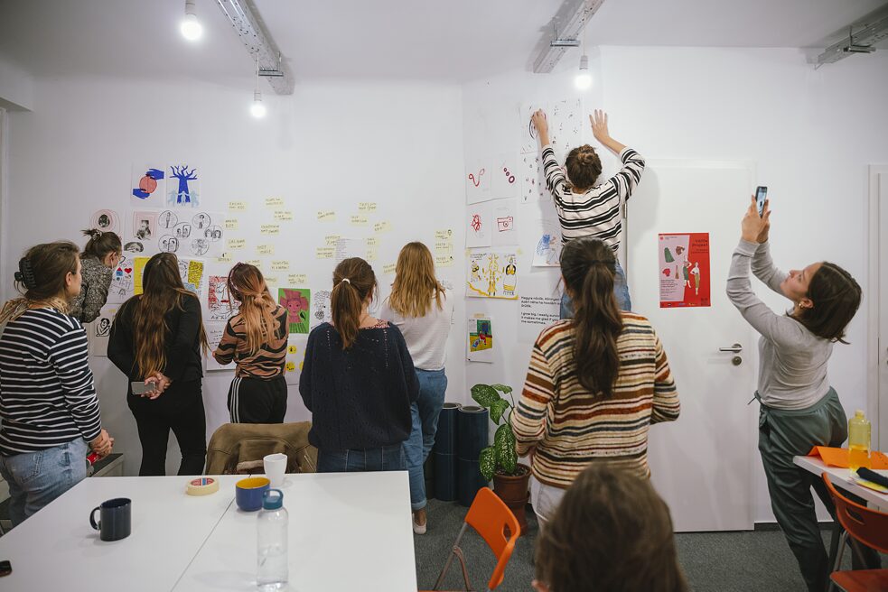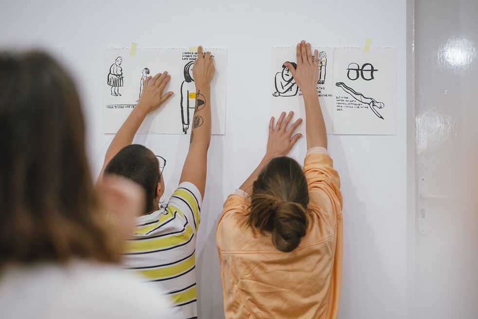 Nach der Vorstellungsrunde machen wir eine gemeinsame Zeichenübung: Die Teilnehmerinnen schließen ihre Augen für 90 Sekunden und zeichnen sich dabei selbst. Die Ergebnisse werden an eine Wand gehängt. Anschließend teilen sich die Teilnehmenden in drei Gruppen, um mit unterschiedlichen Schwerpunkten mit Mini-Zines zu experimentieren: Margot macht mit ihrer Gruppe Schreibübungen, Petra Illustrationen und ich Comics. In meiner Gruppe machen wir erst eine kurze Übung, in der wir Wörter wie Wut, Schluckauf oder Geborgenheit mit abstrakten Zeichnungen visualisieren und wir zeichnen verschiedene Gesichtsausdrücke. Anschließend zeichnen wir Selbstportraits.