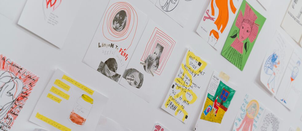 Nach der Arbeit in den drei Gruppen folgt eine Mittagspause. Um wieder gemeinsam in den Nachmittag zu starten, spielen wir ein kurzes gruppendynamisches Spiel. Die nächsten Stunden konzentrieren sich die Teilnehmerinnen auf die Gestaltung ihres Zine-Beitrags. Dabei stehen Margot, Petra und ich nach Wunsch beratend zur Seite. Wer fertig ist, hängt seine gestalteten Seiten an die Wand. Zum Ende des Workshops legen wir gemeinsam die Reihenfolge der einzelnen Seiten im Zine fest. Dabei entscheiden wir in Form einer offenen Diskussion, welche Beiträge gut nebeneinander wirken und legen die Dramaturgie des Zines fest. Zum Abschluss des Tages reflektieren wir unsere Erfahrungen und Eindrücke in einer offenen Gesprächsrunde.