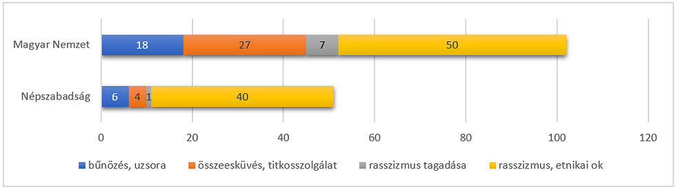 Jedoch spielten in Magyar Nemzet zwei weitere Narrative eine Rolle, die in Népszabadság kaum auftauchten: Etwas mehr als ein Viertel der Beiträge bezüglich der Mordmotive in der rechten Tageszeitung meinte eine Art Verschwörung hinter den Ereignissen erkennen zu können, hauptsächlich eine zu den Geheimdiensten führende Spur, und hinzukam, dass in diesem Blatt mehrmals auch Meinungen geäußert werden konnten, die die rassistischen Motive der Morde ausdrücklich verneinten oder gar widerlegten. Gleich mehrere Publizist*innen von Magyar Nemzet waren der Ansicht [3], dass die Ereignisse „durch politisches Kalkül gelenkt worden waren, es bestand dringender politischer Bedarf, erneut auf die politische Rechte zu ,schießen‘“ – es wurden also Interessen im Hintergrund der Roma-Mordserie vermutet, die mit den Regierungsparteien in Verbindung gestanden haben sollen. [4]