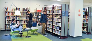 In der Bibliothek steht eine Selbstverbuchungsanlage zur Verfügung. Das Selbstverbuchungsterminal kann nur mit einem gültigen Bibliotheksausweis genutzt werden.