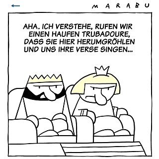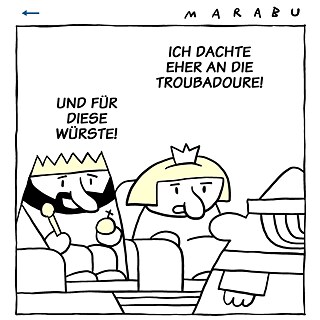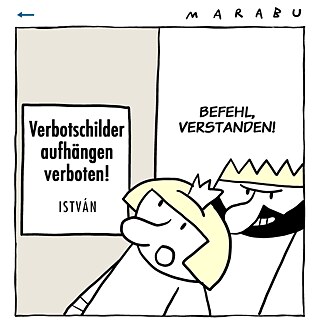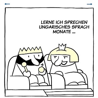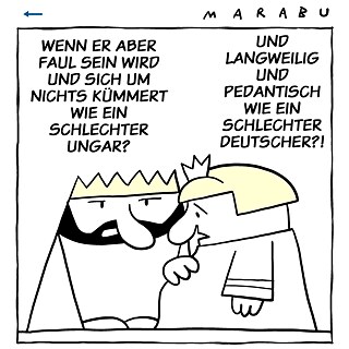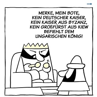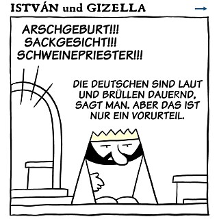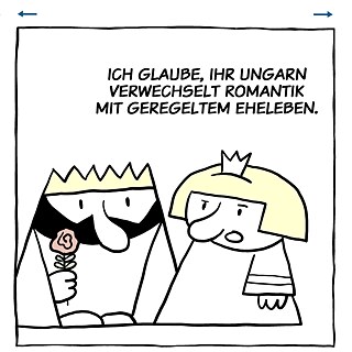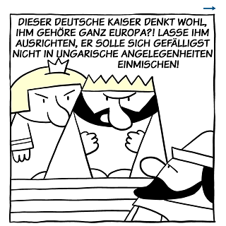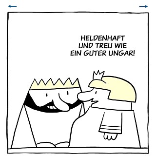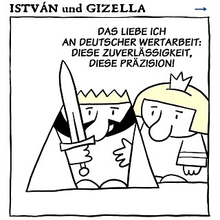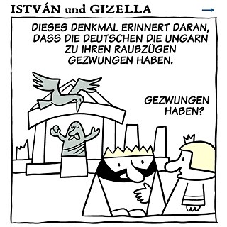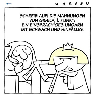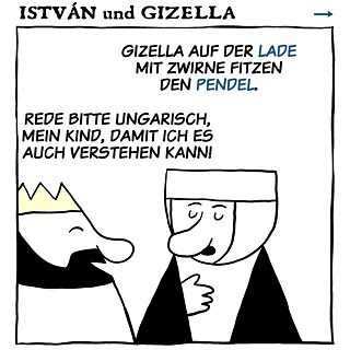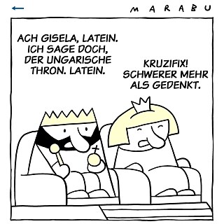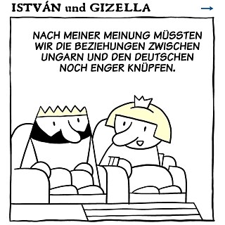 Die deutsch-ungarischen Beziehungen währen nun seit über 1000 Jahren und gehören zu den wohl glücklicheren Verbindungen zwischen zwei Völkern mit geringem historischem Streit- und Konfliktpotenzial. Wie in allen langjährigen Beziehungen gibt es aber natürlich Höhen und Tiefen. Um diese auszuloten haben wir das wohl bekannteste Promi-Ehepaar der ungarisch-deutschen Geschichte, Stephan der Heilige und Gisela von Bayern, in einer Comic-Serie verewigt. In kleinen Episoden ihres Zusammenlebens spießt der Zeichner Marabu Alltagsgeschehnisse auf und zeigt die Herausforderungen der deutsch-ungarischen Beziehungen.
