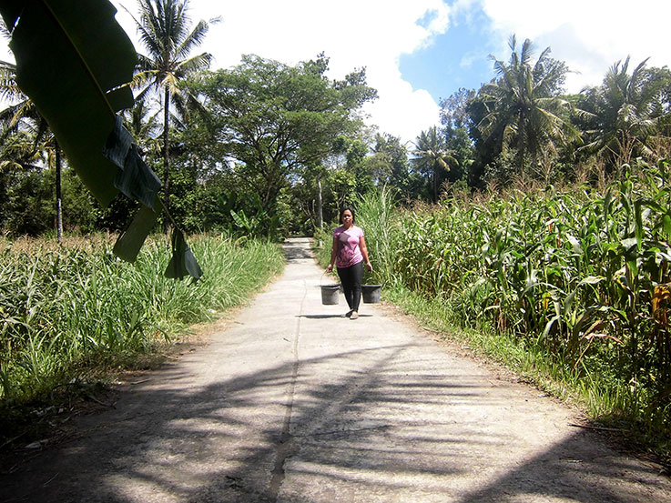 Ein Einwohner, der noch keinen Zugang zu sauberem Wasser hat, trägt eine Kanne in Donomulyo, Unterbezirk Nanggulan, Bezirk Kulon Progo, 23. August 2016. Da er aus ärmlichen Verhältnissen stammt, konnte er zuhause noch keine Wasserleitung installieren. Dies wird sich jedoch ändern, wenn ein Programm eingeführt wird, das die armen Familien in Kulon Progo dabei unterstützt, Zugang zu sauberem Wasser zu bekommen.