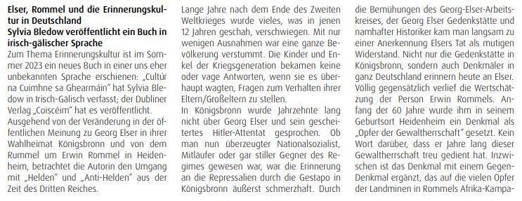 Das Buch, erschienen 2023 bei Coiscéim, Dublin, untersucht die deutsche Erinnerungskultur bezüglich des Naziregimes auf lokaler und nationaler Ebene. Die Autorin geht zunächst von der Erinnerungskultur in ihrem eigenen Umfeld aus und beschreibt den langsamen Wandel in Haltungen gegenüber Ereignissen und Persönlichkeiten des Dritten Reiches. Dann schaut sie auf Entwicklungen in der Erinnerungskultur in Deutschland als Ganzem. Das Schweigen der Nachkriegszeit ist längst gebrochen, aber es herrscht noch häufig Uneinigkeit über die geeignete Form, der Opfer der Verfolgung würdig zu gedenken und die Verbrechen des Nationalsozialismus auch im Bewusstsein kommender Generationen zu halten. Die derzeitige Erinnerungskultur ist nicht lediglich auf die Vergangenheit gerichtet, sondern setzt sich mit den aktuellen Herausforderungen an die Demokratie und eine friedliche, tolerante Gesellschaft auseinander.