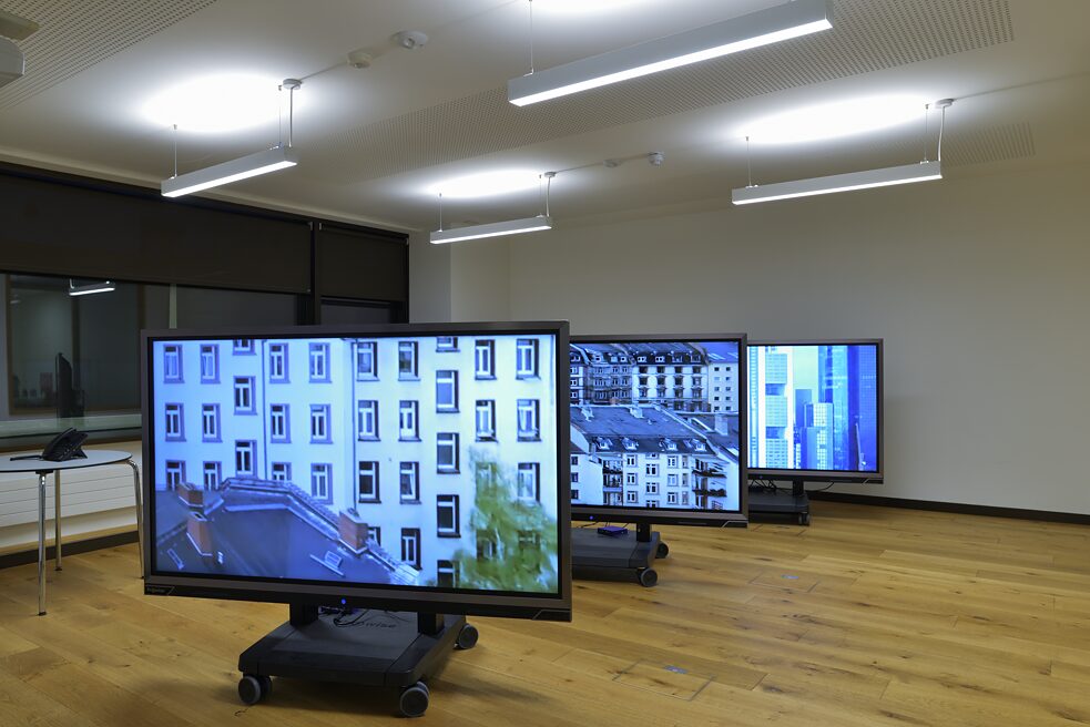 Ackermann’s video works collectively titled Monday Morning were dispersed throughout the language school. The work results from a process of accessing, and harvesting web-cam footage from cities like Frankfurt am Main, or Dublin, which are compiled here and presented as an uncanny return.