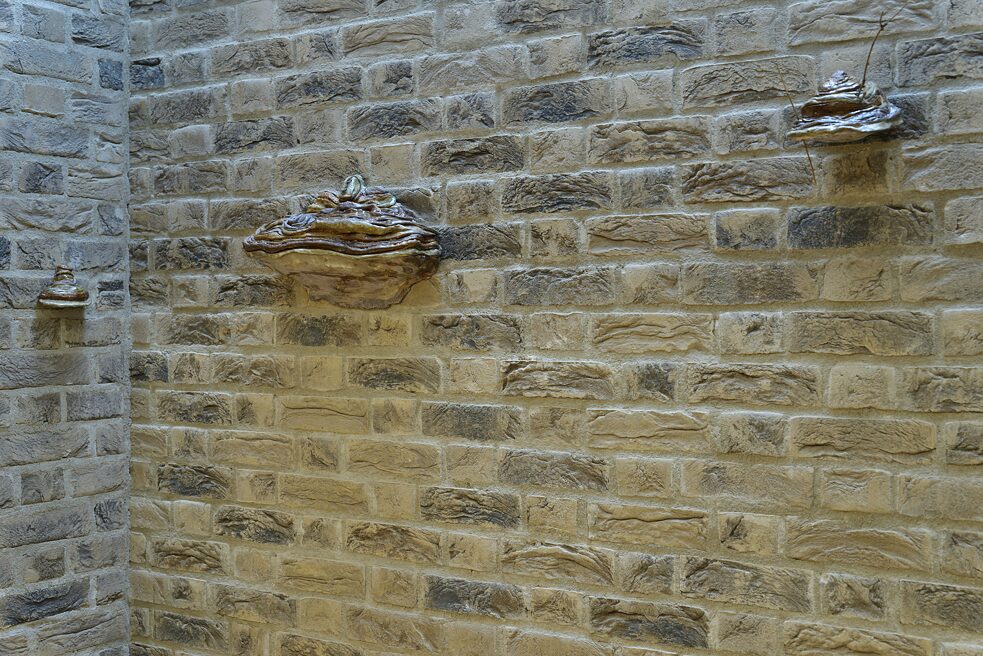 Schreiner presented a dispersed installation of ceramics. These ceramic elements resemble spores and mushrooms emerging disturbingly from the walls of the Goethe-Institut.