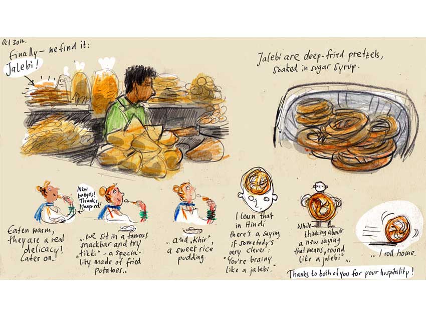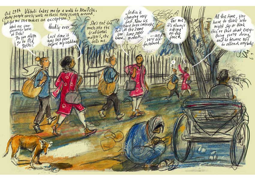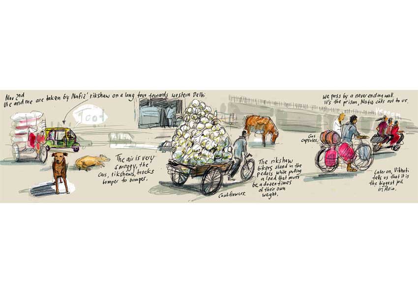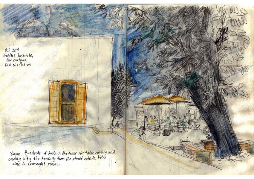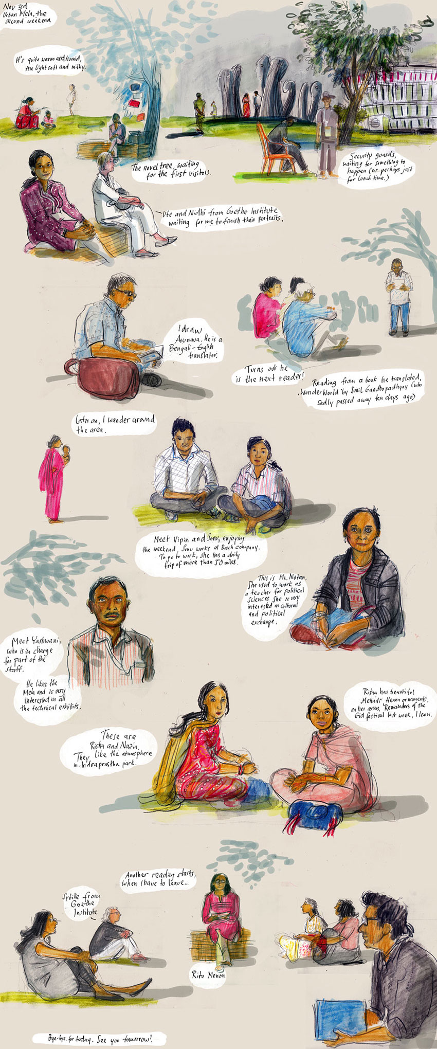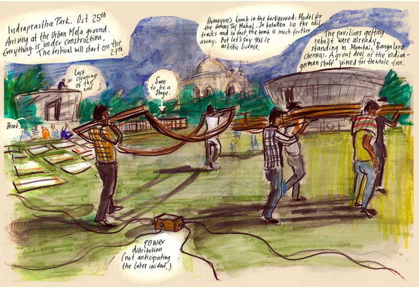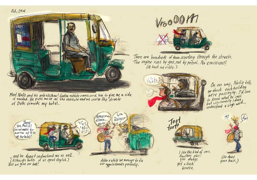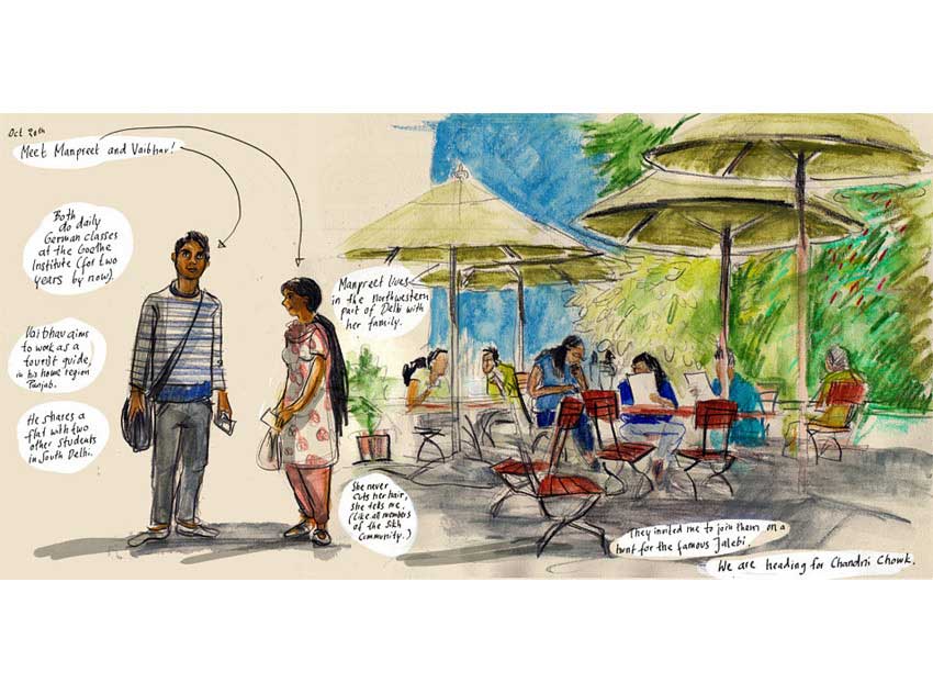 Eine Reise durch New Delhi mit dem Skizzenbuch in der Hand. Die Berliner Comic-Zeichnerin Barbara Yelin wurde vom Goethe-Institut / Max Mueller Bhavan eingeladen, um über die Indo German Urban Mela zu berichten. In ihrem Skizzenbuch hielt sie fest, was sie erlebt hat, berichtet über ihre Begegnungen mit Mela-Besuchern und darüber, was ihr sonst an Bemerkenswertem auf den Straßen Delhis widerfuhr.