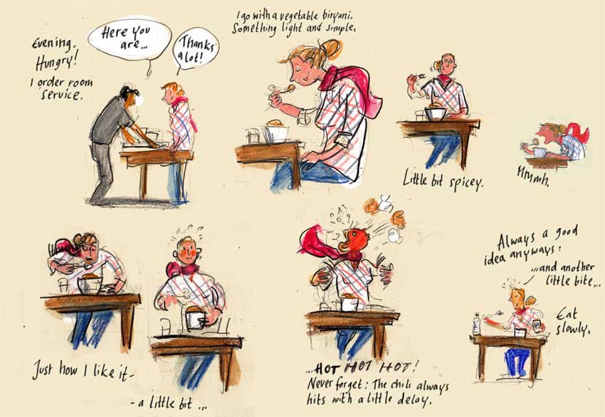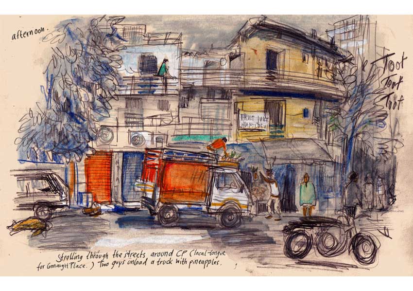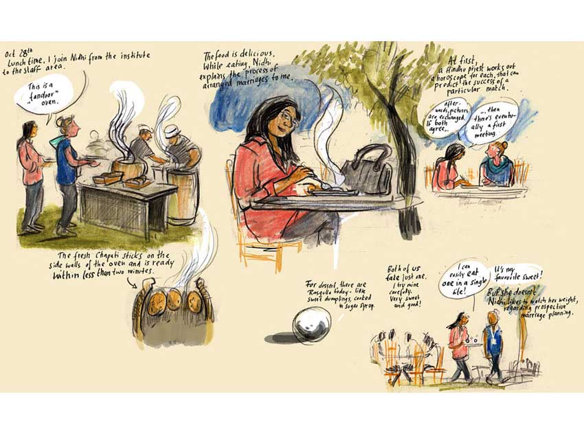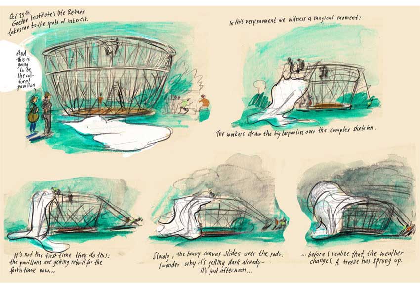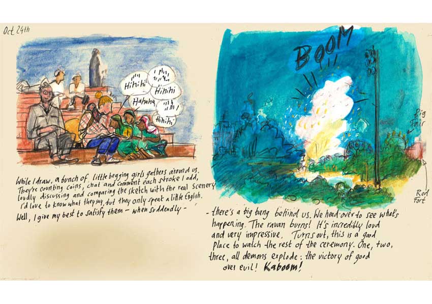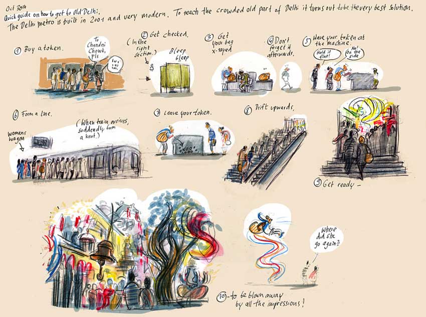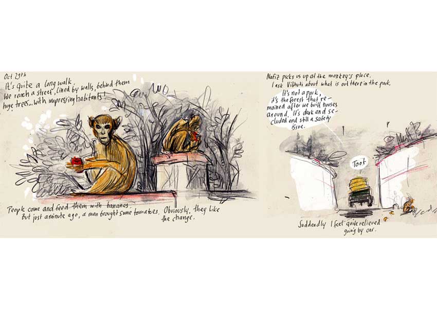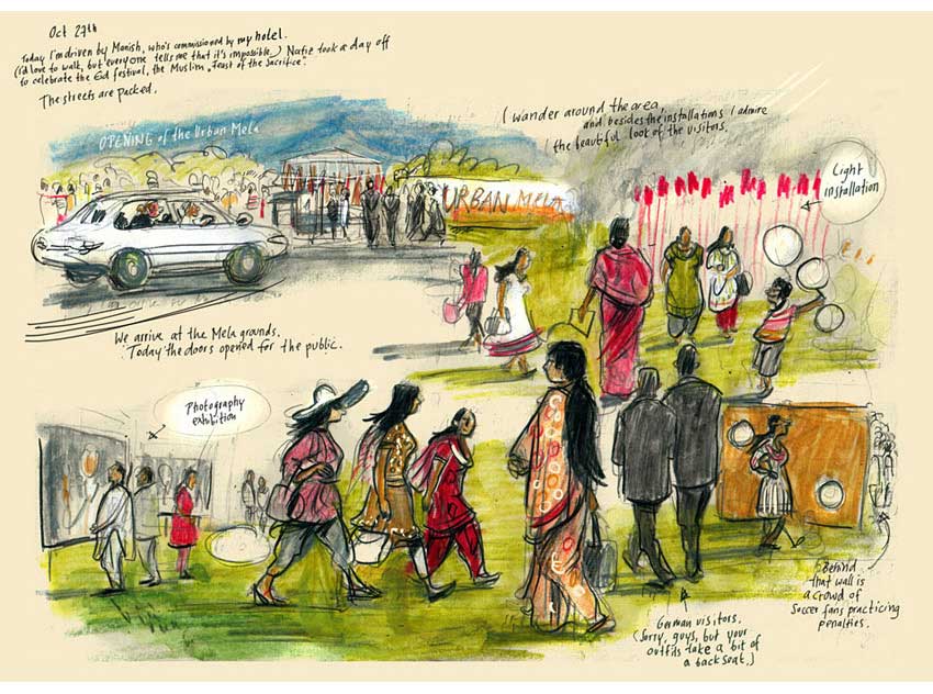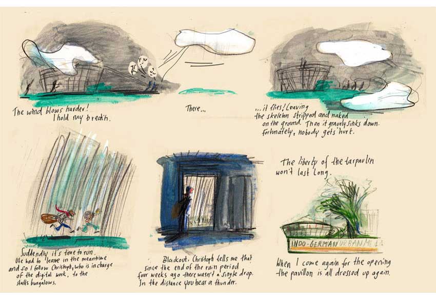 Eine Reise durch New Delhi mit dem Skizzenbuch in der Hand. Die Berliner Comic-Zeichnerin Barbara Yelin wurde vom Goethe-Institut / Max Mueller Bhavan eingeladen, um über die Indo German Urban Mela zu berichten. In ihrem Skizzenbuch hielt sie fest, was sie erlebt hat, berichtet über ihre Begegnungen mit Mela-Besuchern und darüber, was ihr sonst an Bemerkenswertem auf den Straßen Delhis widerfuhr.