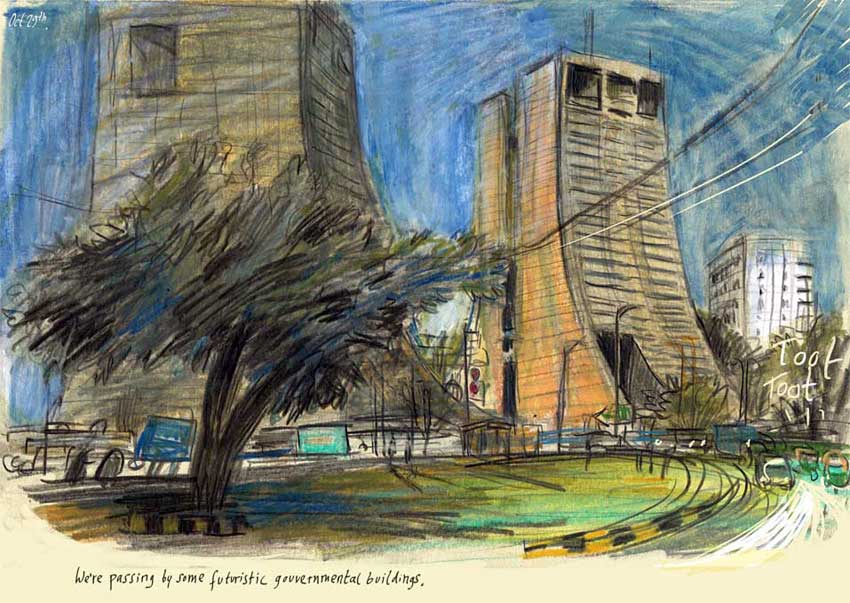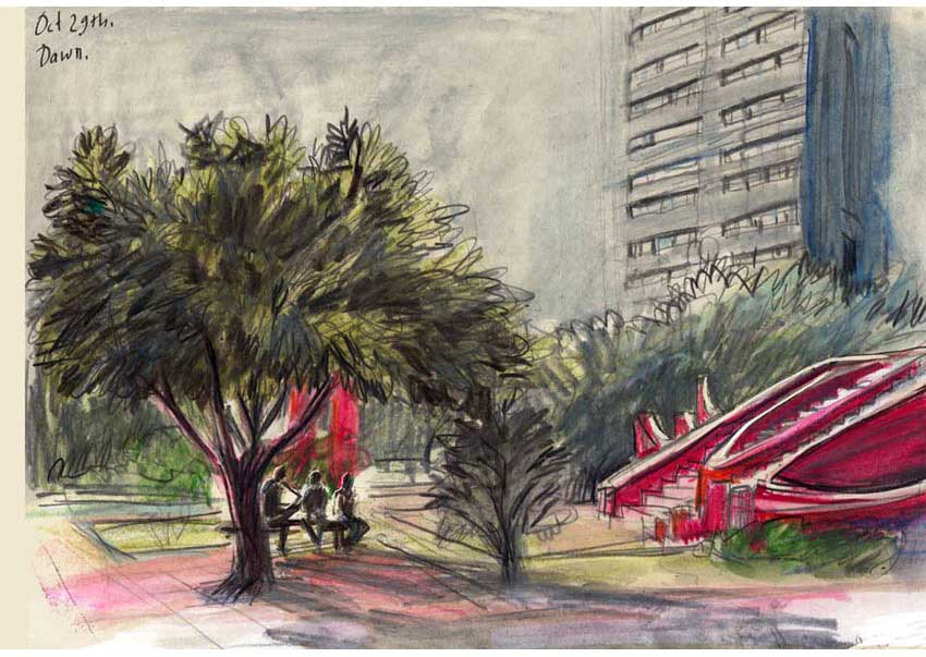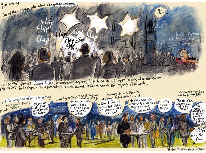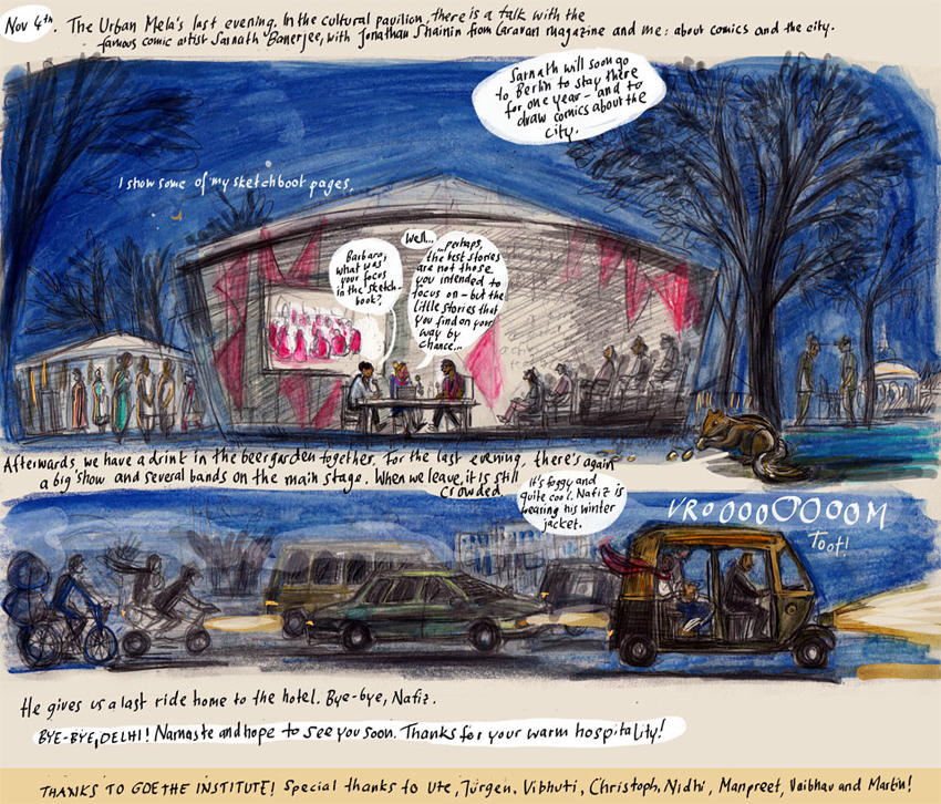 Der letzte Abend der Urban Mela in Delhi. Ein Gespräch über Comics und die Stadt im Kulturpavillon. Gemeinsam den letzten Abend verbringen, eine abschließende Fahrt mit der Rikscha und auf Wiedersehen.