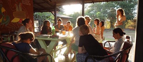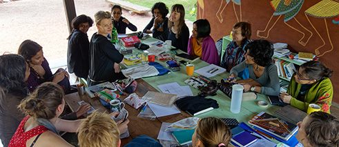 Nach dem morgendlichen Aufwärmen verteilten sich die Teilnehmerinnen auf dem einladenden Gelände von Nrityagram und arbeiteten an den eigenen Geschichten. Der lockere Zeitplan ermöglichte zwischendurch Arbeitsgespräche in kleinen, sich spontan findenden Gruppen zu dritt, viert oder mit noch weiteren. Während ich meine eigenen Aufzeichnungen aufs Papier schmiss und mit einem Ohr hier und da etwas von den Gesprächen aufschnappte, bekam ich mit, dass sich die Diskussionen gar nicht unbedingt immer um die Arbeit drehten. Vielmehr ging es in den offen geführten Gesprächen um die unterschiedlichen Kulturen, was den Illustratorinnen neue Einsichten vermittelte und auch in der Arbeit später seinen Niederschlag fand. (Ich bin überzeugt, dass kein vorab organisierter Vortrag zu Genderthemen eine entsprechende Intensität hätte erzeugen können, wie wir sie hier erfahren durften.)