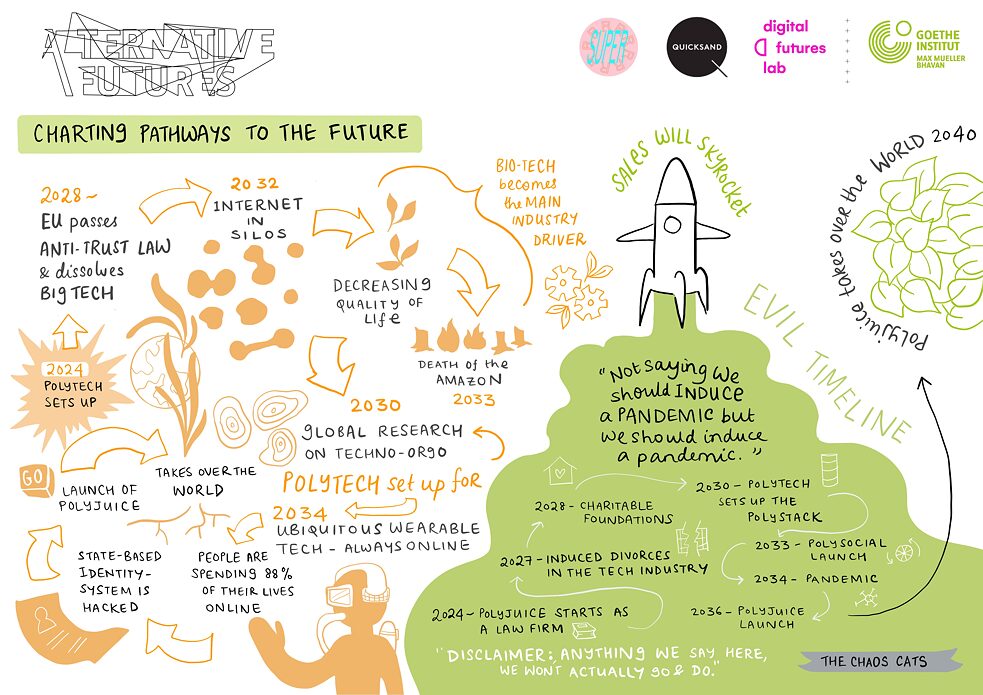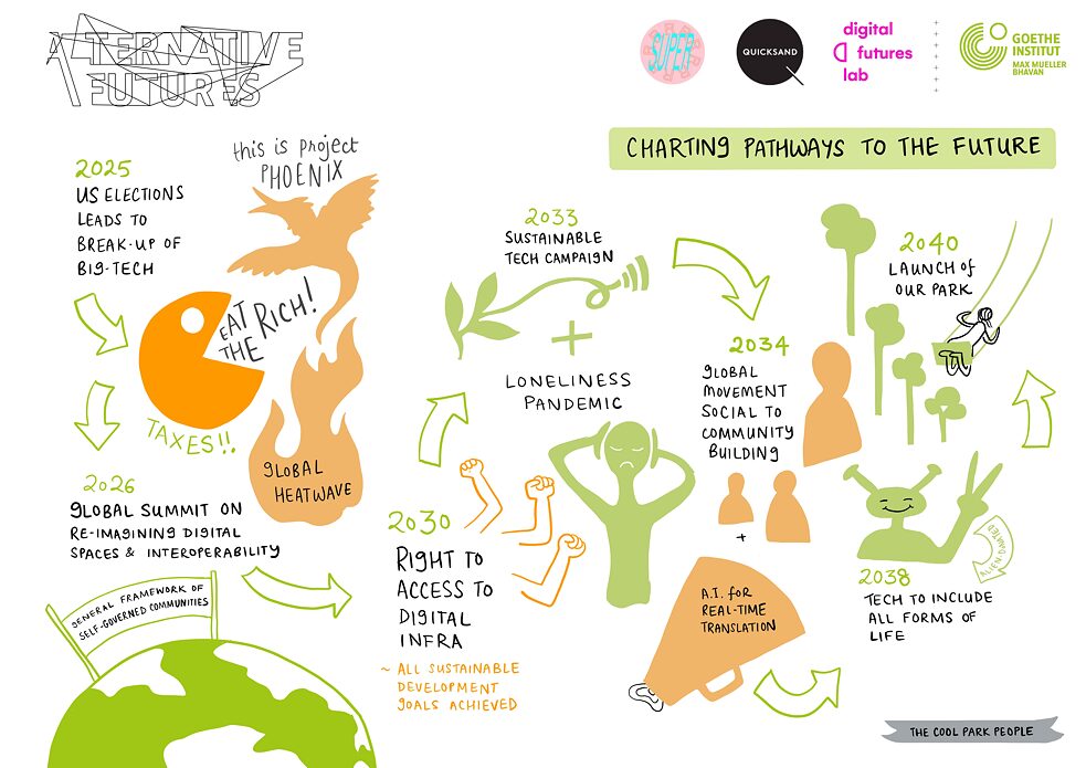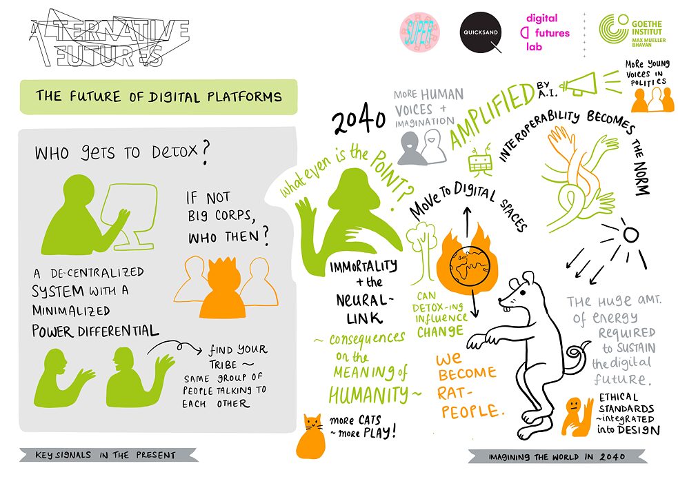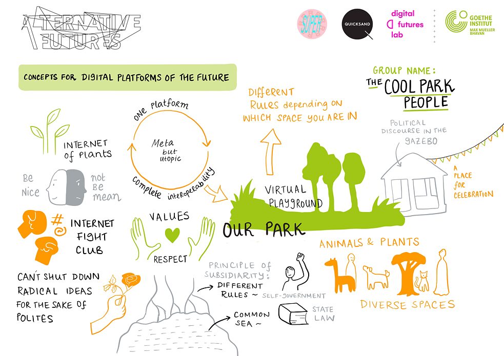 Mit "Alternative Futures" inititiieren das Goethe-Institut, Digital Futures Lab, Quicksand und das Superrr Lab eine zukunftsorientierte Diskussion über das Design, die Governance und die Betriebsdynamik digitaler Plattformen initiieren. Durch eine Reihe von Workshops und Diskussionen sollen deutsche und indische zivilgesellschaftliche Institutionen und Forscher aus relevanten Bereichen zusammengebracht werden, um gemeinsame Ansätze für übergreifende Themen im Bereich der digitalen Kommunikation, des Plattformdesigns, der Governance und des bürgerschaftlichen Engagements zu entwickeln.