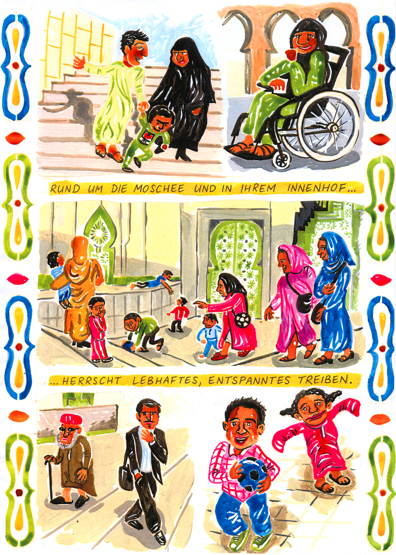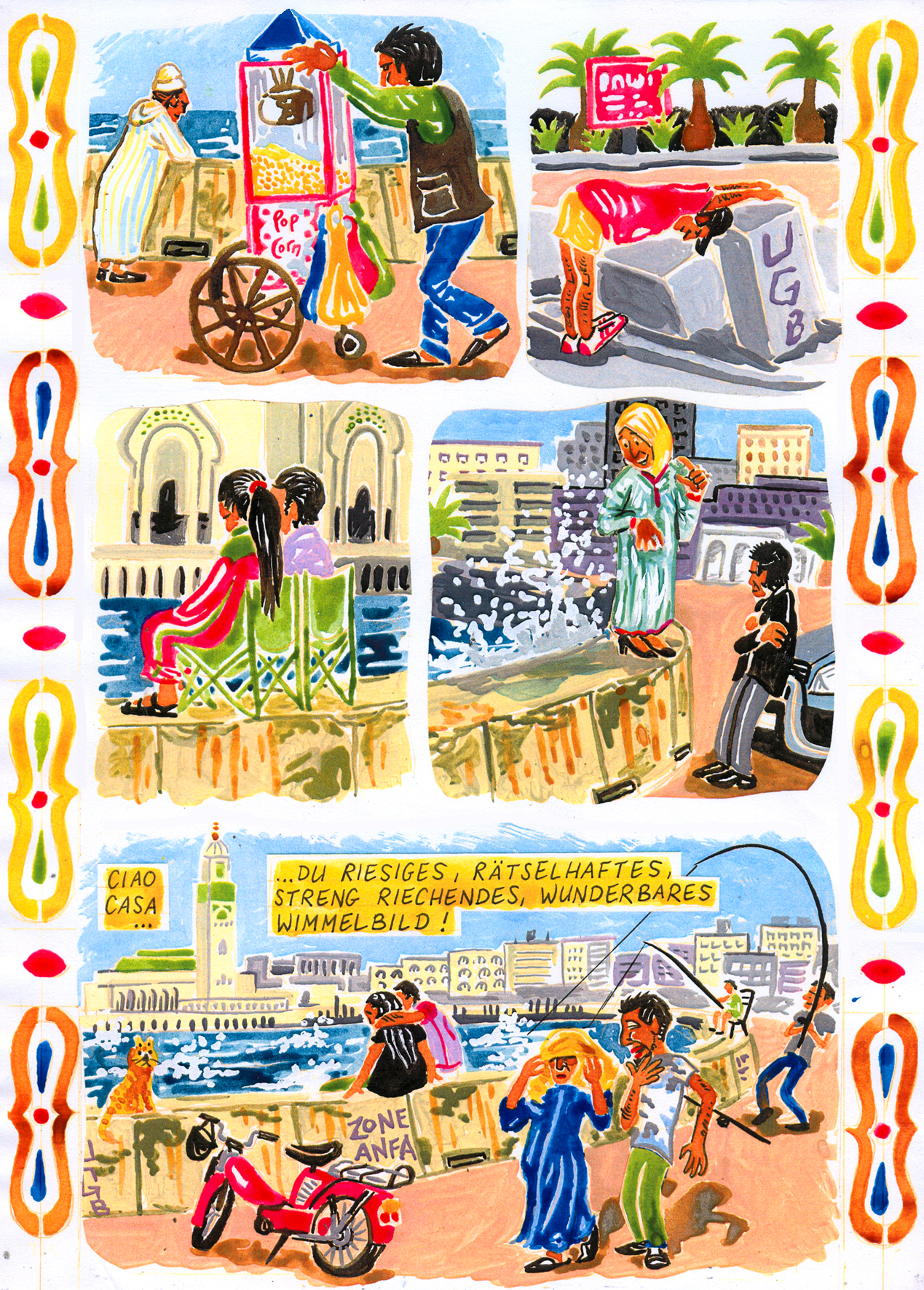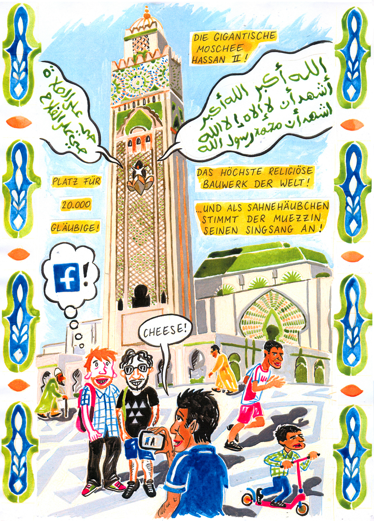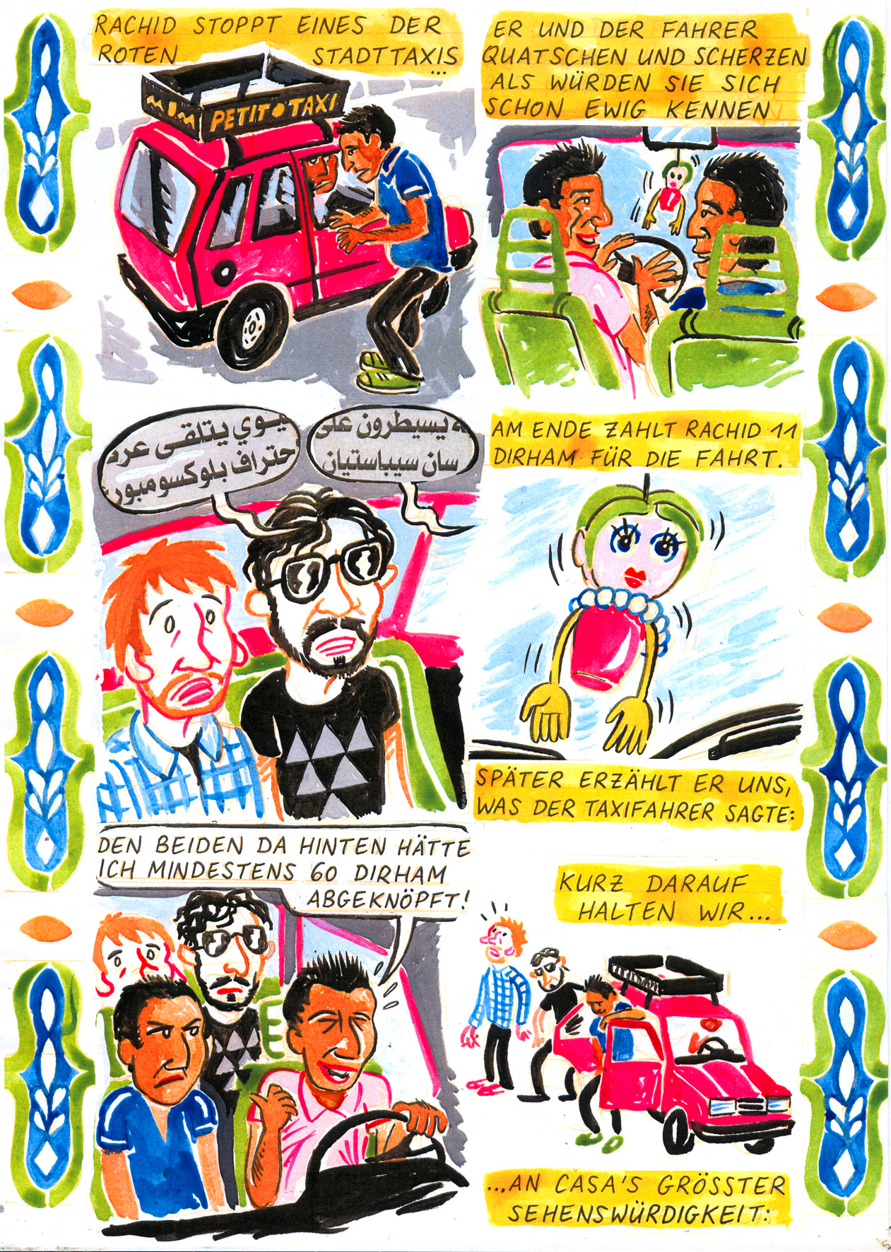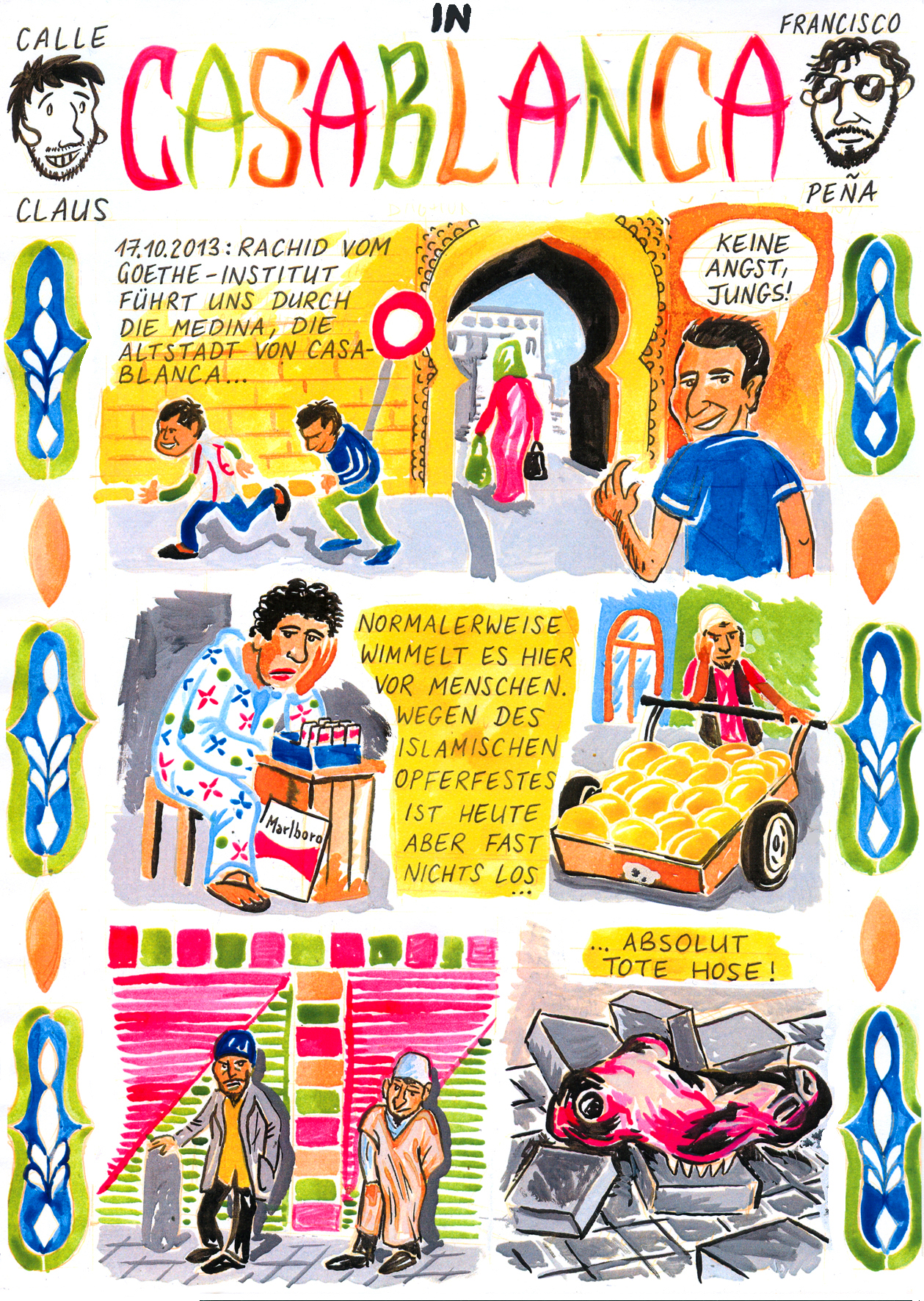 Alltagshelden Der Illustrator und Comiczeichner Calle Claus zeigt Casablanca – die größte Stadt Marokkos. Auf Einladung des Goethe-Instituts reist er im Oktober 2013 als Teil des Projekts "Comic Transfer". Calles "Casablanca"-Comic hat fünf Seiten, 22 Panels. Eine Stippvisite in drei kurzen Episoden: ein Spaziergang durch die Altstadt, eine Taxifahrt, dann Eindrücke, Vielfalt rund um Moschee und Uferpromenade.