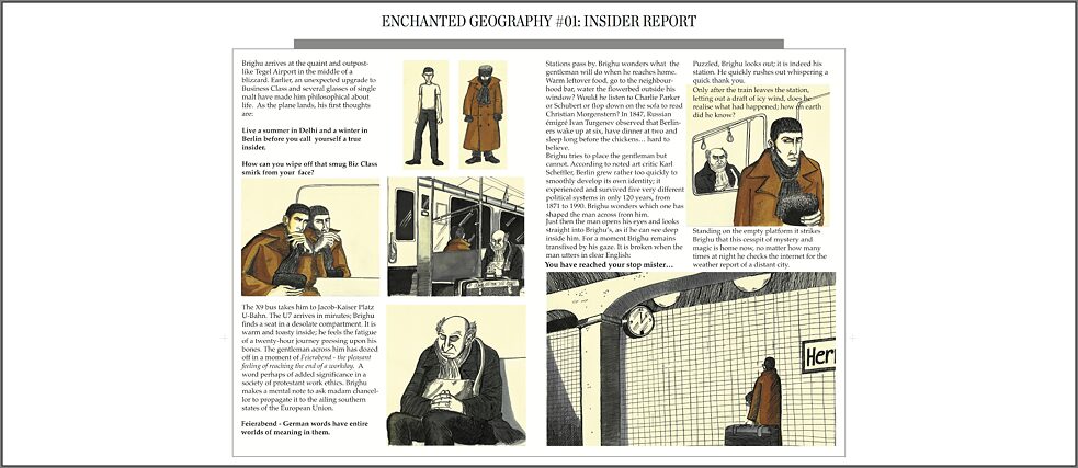 Die siebzehn Kolumnen, die der Wahlberliner 2013 für The Hindu, eine der größten indischen Tageszeitungen, verfasst hat, dokumentieren diese Phänomene, belassen es aber nicht dabei. Generell kann die Aufzählung dessen, was die Kolumne nicht ist, helfen, ihren Charakter ein Stück weit zu erfassen. Zunächst: Sie ist kein Comic, sondern eine Bild-Text-Collage mit Comic- und Foto-Elementen. Sie ist keine reine Berlin-Dokumentation, keine journalistische Reportage, keine autobiografische Erzählung, keine pure Fiktion. Sie ist von allem ein bisschen, eine Berliner Mélange, das berühmte postmoderne Palimpsest – und genau das macht ihren Reiz aus.
