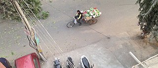 Selbst versorgen musste ich mich in den letzten drei Monaten. Ich war sehr froh, dass ich bis dahin schon wusste, wo und wie man einkauft. Am Anfang wäre ich wahrscheinlich verhungert, denn es gibt in Indien keine Supermärkte, in denen man eben mal seinen gesamten Einkauf erledigen kann. Viele Lebensmittel werden von fliegenden Händlern wie dem Gemüseverkäufer auf dem Bild verkauft. Der radelt dann durch die Straße und man muss ihn genau abpassen. Zum Glück gibt es an jeder Ecke Imbissbuden mit köstlichen Snacks.