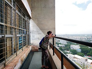1 Tag später: nach einem nächtlichen Schauer ist es wunderbar sonnig und ein angenehmer Wind bringt Frische in die Stadt. Ramli, ebenfalls gute Seele des Hauses, serviert uns köstliche Dosas und Kaffee mit Chicoree zum Frühstück. Gut gestärkt und gerüstet starten wir zu unserem ersten Aufnahmeort, den Visvesvaraya Towers im Herzen Bangalores. Es handelt sich um ein brutalistisches Gebäude in dem nun einige staatliche Ministerien, eine Lotterie, und viele weitere Institutionen mit langen und unverständlichen Namen untergebracht sind. Wir geben uns etwas naiv - und haben Glück.