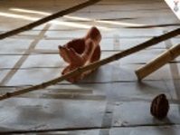 Dann der tolle Bambus. Die Gerüste aus Bambus haben mich schon immer fasziniert. Nun in Kochi sehe ich die Möglichkeit, selbst zu lernen wie man mit Bambus arbeiten kann. Ich besorge mir lange Bambusstangen und der Mann, der sie bringt, kann mir sogar zeigen, wie man daraus ein Gerüst baut. Ein toller Tag. Es entsteht ein „weiches“ Gerüst, das weniger tragende Funktion hat, als dass es sich an den Raum anlehnt. Für den zweiten Teil der Installation übertrage ich die Struktur des Gerüstes als Schatten mit Steinpuder auf den Boden.
