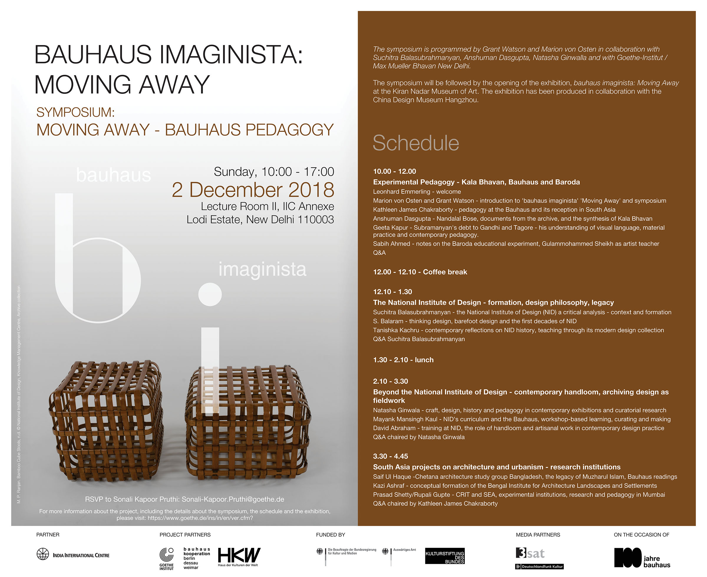 Kunst-, Gestaltungs- und Architekturlehre und ihren Bezug zur Gesellschaft nachzudenken. Wenngleich das Bauhaus dafür die gemeinsame Bezugsgröße bildet, soll es weder andere bedeutende Bildungsexperimente des 20. Jahrhunderts ausblenden, noch uns auf ein Denken in ideengeschichtlichen Einflüssen festlegen. Denn während manche Hochschulen in der Welt oft mit Hilfe emigrierter ehemaliger Bauhaus-Meister oder -Studenten direkt an dessen Pädagogik anknüpften, entwickelten sich andere zeitgleich und eigenständig oder auch in ausdrücklicher Abkehr von den Bildungsvorstellungen des Bauhauses. Auf Basis der fachwissenschaftlichen Forschung unserer indischen Projektpartner befasst sich das Symposium zur Ausstellung bauhaus imaginista: Moving Away anhand einschlägiger Beispiele aus Gegenwart und Vergangenheit mit der Kunst- und Gestaltungslehre auf dem Subkontinent, darunter vor allem mit der Hochschule Kala Bhavan in Santiniketan, der Faculty of Fine Arts MSU in Baroda und dem National Institute of Design in Ahmedabad.