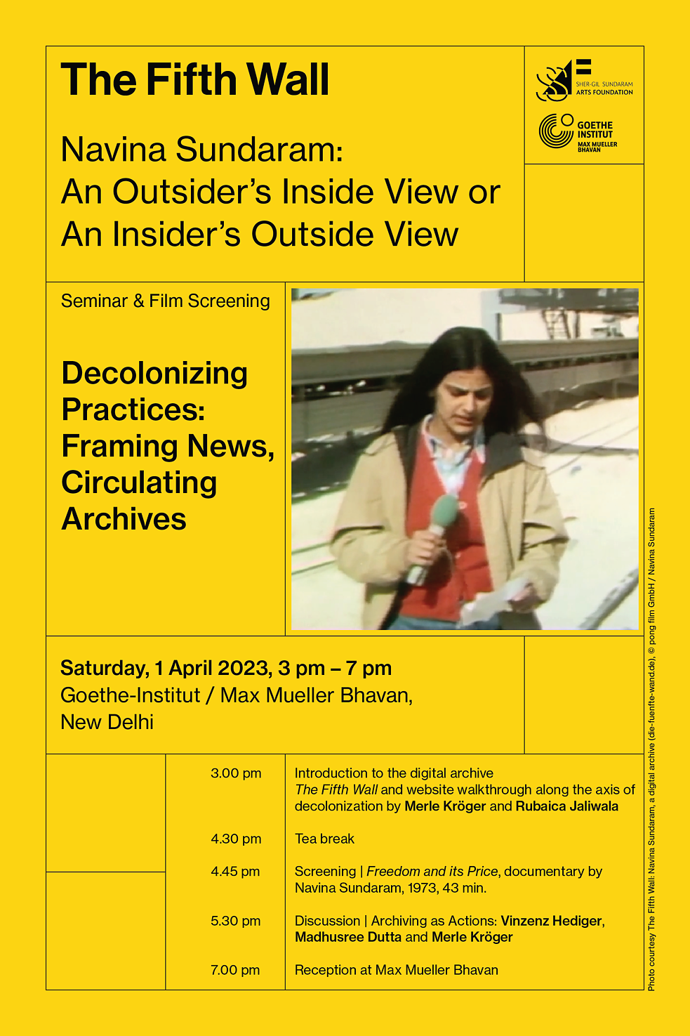 Die fünfte Wand versammelt Filme, Reportagen, Moderationen, Texte, Briefe und Fotos der Filmemacherin und Redakteurin Navina Sundaram aus über 40 Jahren Tätigkeit für das Fernsehen. Extrahiert aus Archiven der ARD sowie aus Sundarams Privatarchiv, ist Die fünfte Wand ein kuratierter Blick auf deutsche Migrations- und Mediengeschichte. Navina Sundaram steht dabei im Zentrum als eine Autorin, die journalistisch Position bezieht: zu Internationalismus und Dekolonisierung, Klassenfrage, Rassismus, Einwanderung, zu indischer und bundesdeutscher Politik.