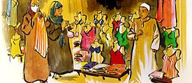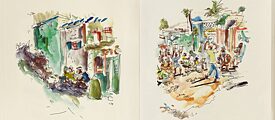 Reinhard Kleist's travel sketches and watercolours from Algeria: 10 miniatures, almost all in colour. Sandy brown. Lots of vivid blue Alleyways full of steps and rows or networks of small balconies with colourful curtains billowing in the wind.