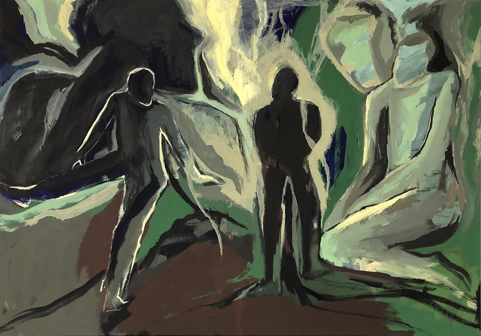Freedom is liberating, we are all one, a part of nature, and speak the universal language of love. The painting depicts all humans as one, blended into one another, searching for peace and happiness. We all strive for happiness, the source actually lies within us. We just need to be aware of it. To be free of all the external judgements and mental barriers that we built for ourselves and others. If only each individual could feel free and be supported by each other, we could function well as a community. This is what the painting ‘Look Within’ (70 x 100 cm, acrylics on canvas) conveys. Each individual has to consciously make the effort to build a peaceful world where everyone feels free.