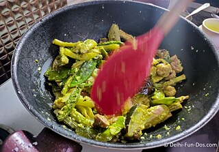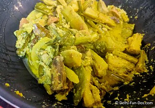 - Heat oil in a big wok. Mildly fry all the vegetables one by one and set aside. Fry Bodi till it is brown and crisp and set aside.