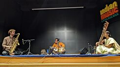 My priority as a saxophonist was to take lessons, practice, exchange ideas, rehearse and perform with other musicians 6 weeks later. The first session was with Tavil Raja, a pioneer of Carnatic jazz fusion music. I then met a prominent ghatam player Giridhar Udupa. The sessions were super fun and they introduced me to the rhythmic complexity of Carnatic music. Udupa engaged me with for a gig and through his offer, I even had a prospective artist's accommodation. He also organised a meeting with Vidwan Dakshinamurthy, a nadaswaram player par excellence, who would become my guru. I spent many hours with Dakshinamurthy and we even played together at a temple one morning. The nadaswaram had fascinated me for a long time and motivated me to expand my sound spectrum on the saxophone. Lessons with him gave me my first insight into Carnatic ragas and the art of ornamentation. Under his guidance, I began to learn a thillana from the legendary 1968 Tamil flm Tillana Mohanambal and transcribed it in Western notation. All this happened without us being able to communicate much with each other in English.