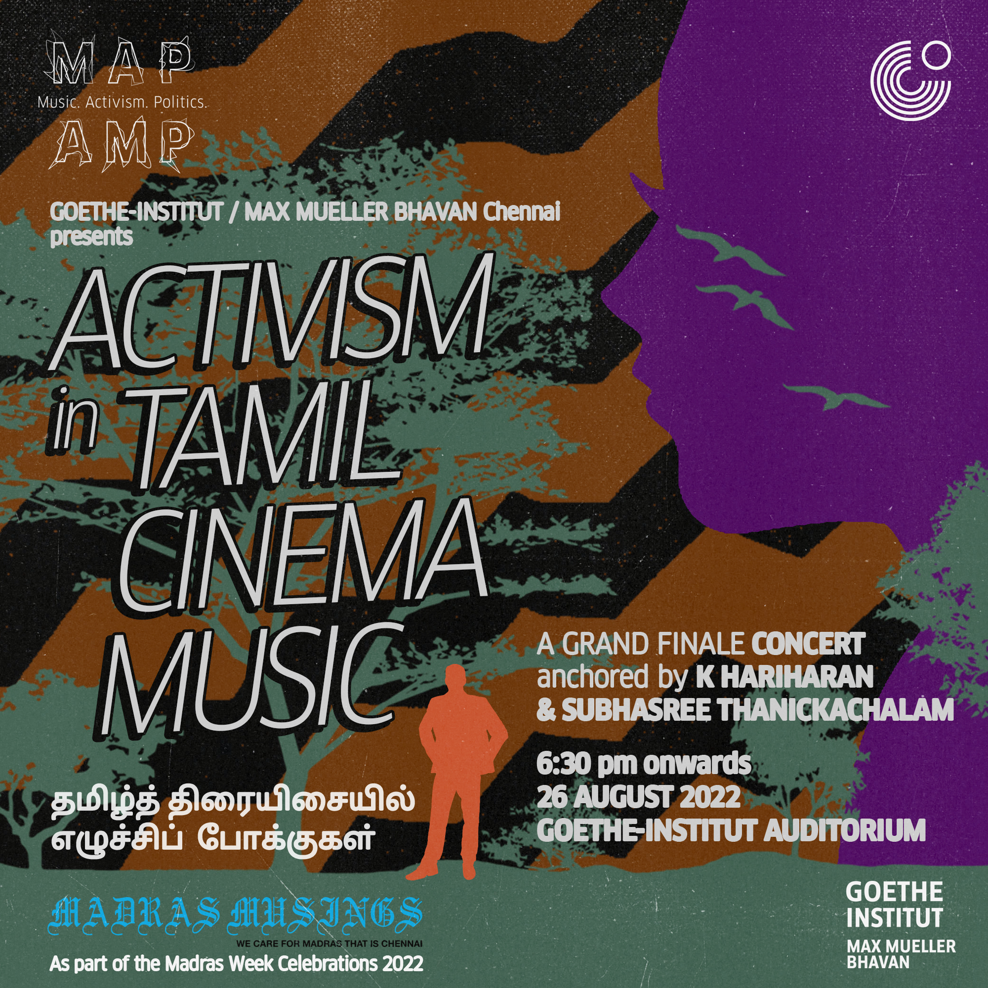The Grand Finale Concert is on 26th August 2022 at 6.30 pm at Goethe-Institut Auditorium. We welcome you all to Goethe-Institut Chennai to enjoy and experience this exclusive recreation of activist Tamil film songs and to relive those moments and memories.