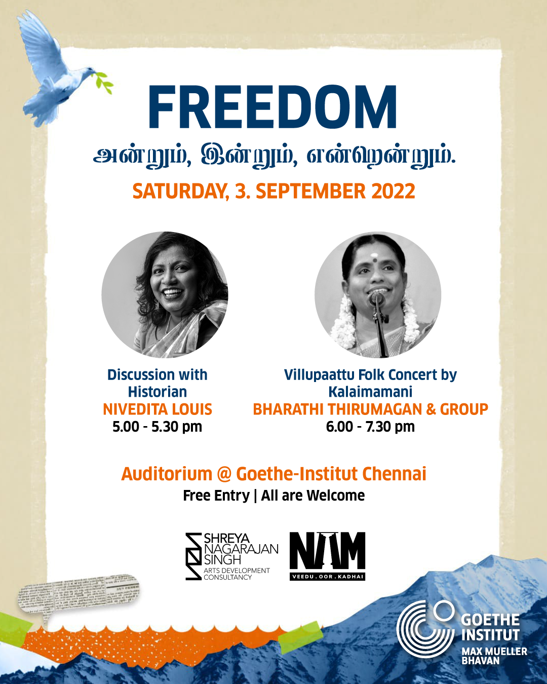 5.00 – 5.30 pm: Conversation with the historian, Ms. Nivedita Louis6.00 – 7.30 pm: A villuppaattu folk concert by Kalaimamani awardee Mrs. Bharathi Thirumagan