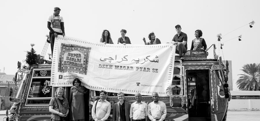At first sight, Karachi may seem like a relentlessly growing bustle of people, cars, rickshaws, and colors, traversed by traffic noise and fish odour. Sitting atop the roof of a colorful tourist bus, German and Pakistani poets, translators, a photographer, and the staff of the Goethe Institute gaze at this bustle of Karachi from above.