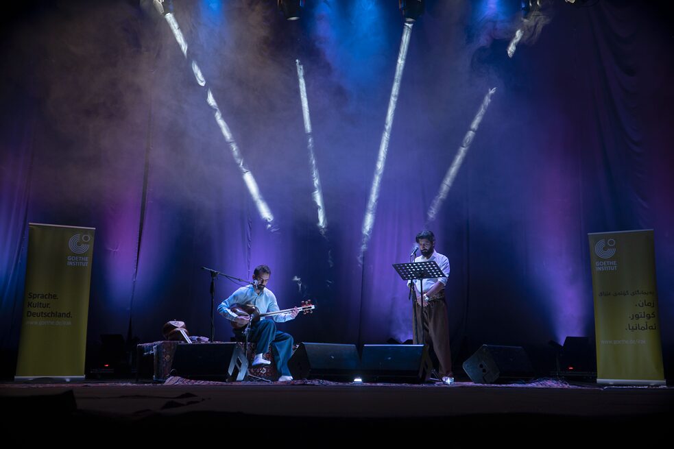Tar-Spieler und Komponist Dana Muhedin und Vokalist Ryad Osman während eines Konzerts in Sulaymaniah
