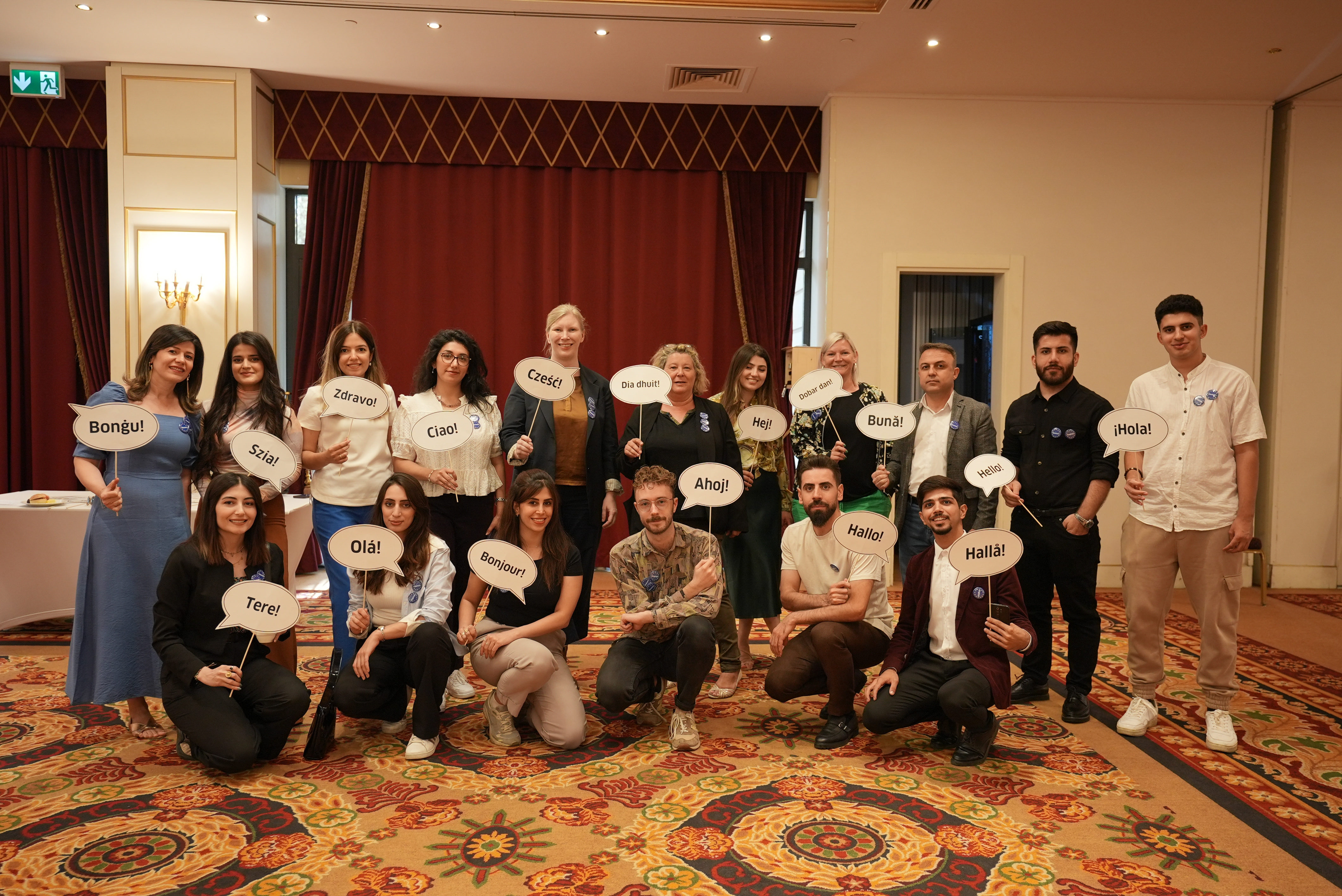 Eine Gruppe Menschen hält Probs mit Grüßen in verschiedenen Sprachen hoch