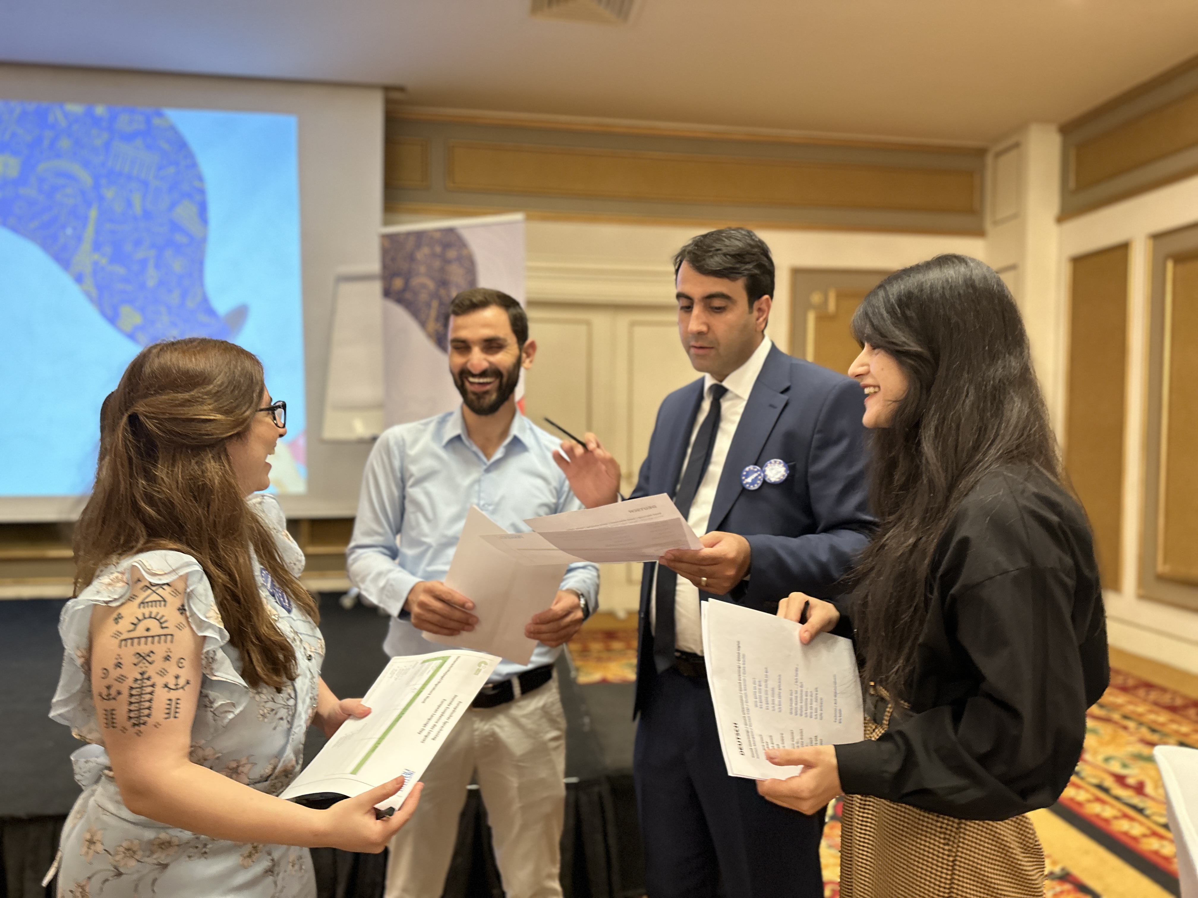 Zwei junge Frauen üben mit dem Generalkonsul die deutsche Sprache.