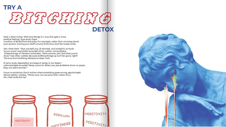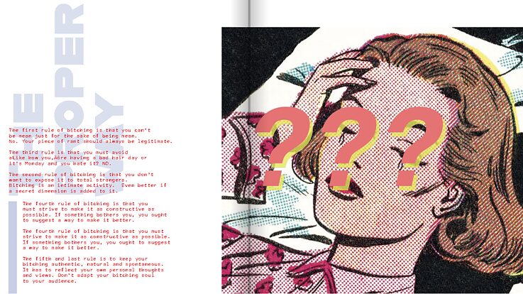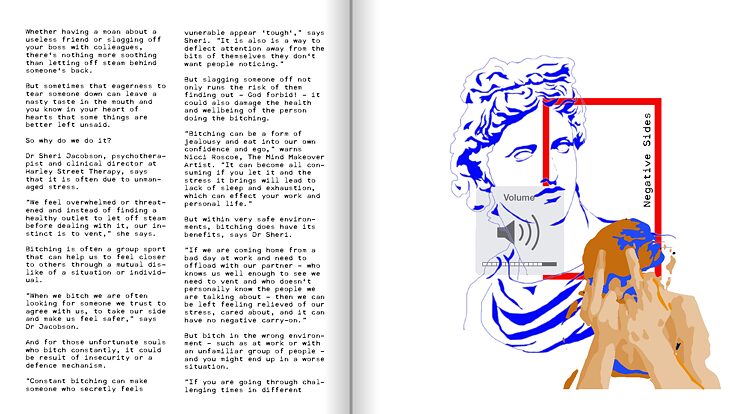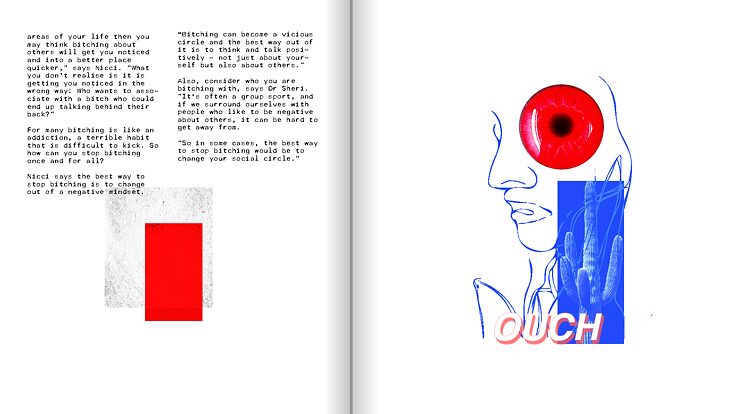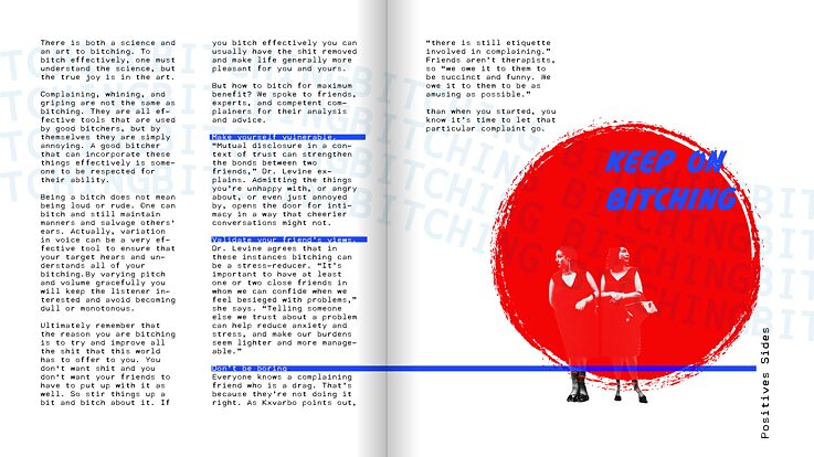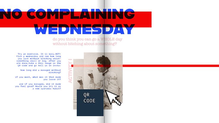 The first issue that will be used in this collaboration is "bitching". lt explains the term "bitching", the effects of it, whether it be good or bad. The psychological explanation behind it and so on. It is a piece that has the feel of a zine, but online and with small details that are animated. The animations serve for both entertainment and giving the readers small "activities" related to the main subject of the determined issue. The activities are a challenge like a "no complaining Wednesday", with a little "diary page" for the reader to screenshot, write how they felt without complaining for a day, and post on their insta story.