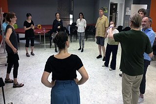 Auch in der Fortbildung für Deutschlehrende lag der Fokus auf Klang und Rhythmus der deutschen Sprache. Bewusst griff Anne Zühlke die Inhalte des Workshops vom Vortag auf, erweiterte sie aber um die methodisch-didaktische Perspektive der Lehrenden. Dieses Vorgehen ermöglichte es den Teilnehmenden der Fortbildung, sich dem Gegenstand als doppelte Beobachtung zu nähern und selbst zum Lernenden zu werden. Verstärkt wurden Methoden vermittelt und erprobt, mit denen Gedichte, aber auch andere Textarten im Chor gesprochen werden können. Auch wurde anhand spielpraktischer Übungen die Wirkung von körperlicher Präsenz im Auftritt oder das logische Stellen von Bildern für eine gelungene szenische Umsetzung von Text ausprobiert. Viel Anklang fand zum Beispiel Anne Zühlkes Idee, vom bekannten Rollenspielformat „Pen and Paper“ ausgehend, die W-Fragen einer Geschichte per Würfel entscheiden zu lassen. Die Aufgabe der Lernenden ist, anhand dieser Eckdaten eine Geschichte zu entwickeln und anhand szenischer Standbilder umzusetzen. Im zweiten Teil des Workshops wurde intensiv mit Texten aus aktuellen Jugendbüchern gearbeitet. Anhand von theaterpädagogischen Verfahrensweisen versetzten sich die Lehrenden durch sprach- und spielpraktische Übungen in verschiedene emotionale Bedeutungsebenen der Texte. Anne Zühlke hat in der Fortbildung viele fundierte, aber gleichzeitig spielerische Möglichkeiten aufgezeigt, Lernende unterschiedlichen Alters und Sprachniveaus anzuleiten, kreativ und entwicklungsoffen Inhalte zu gestalten. Die vielen Impulse und konkreten Ideen für die Umsetzung können die Lehrenden nun aktiv im Unterricht anwenden.