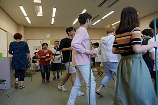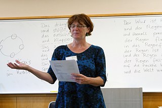 Anhand von literarischen Texten und Gedichten brachte Anne Zühlke den Jugendlichen den Zusammenhang von Text, Klang und den Bedeutungsebenen näher. Mit methodischer Vielfalt verstand sie es, die Lernenden auf den Niveaus A1 und A2 zu motivieren und sprachliche Hemmungen zu überwinden. Ein Mittel dafür war, Klang und Rhythmus der deutschen Sprache in der Verbindung mit Klopf- und Klatschlauten physisch erfahrbar zu machen. Nach ersten konsonantischen Aufwärmübungen wurde im Kreis ein Gedicht eingeübt. Dabei übernahm jede/r zunächst nur ein Wort, das sich reihum in das Gefüge eines Gedichtes einbettete. Nach einigen Übungen gelang es den Schülern und Schülerinnen sogar, sich kreis um Stäbe zuzuwerfen und im Takt des Wurfes das Gedicht aufzusagen. Anne Zühlke geht beim Erarbeiten von Texten und Szenen stets vom Kleinen ins Große über. Wichtiges Element, gerade beim Arbeiten mit Jugendlichen, ist das gemeinschaftliche Entwickeln einzelner Bestandteile in der Gruppe. Besonderes Highlight war die Vertonung japanischer Haikus in deutscher Übersetzung. In kleinen Gruppen wurde eine den Text und seine Bedeutung tragende Geräusch- und Klangmelodie entwickelt und schließlich in einer szenischen Lesung aufgeführt. Den Abschluss des Tages bildete die komplexe Wort und Geräuschkulisse von Walter Mehrings Gedicht „Sechstagerennen“, dem sich die Schüler und Schülerinnen als vielstimmiger Sprechchor und sogar mit einzelnen Solorollen, annahmen. Durch die Gemeinschaft in der Gruppe wurde selbst dieser anspruchsvolle Text für die Lernenden mit Spaß am Gegenstand erfahrbar.